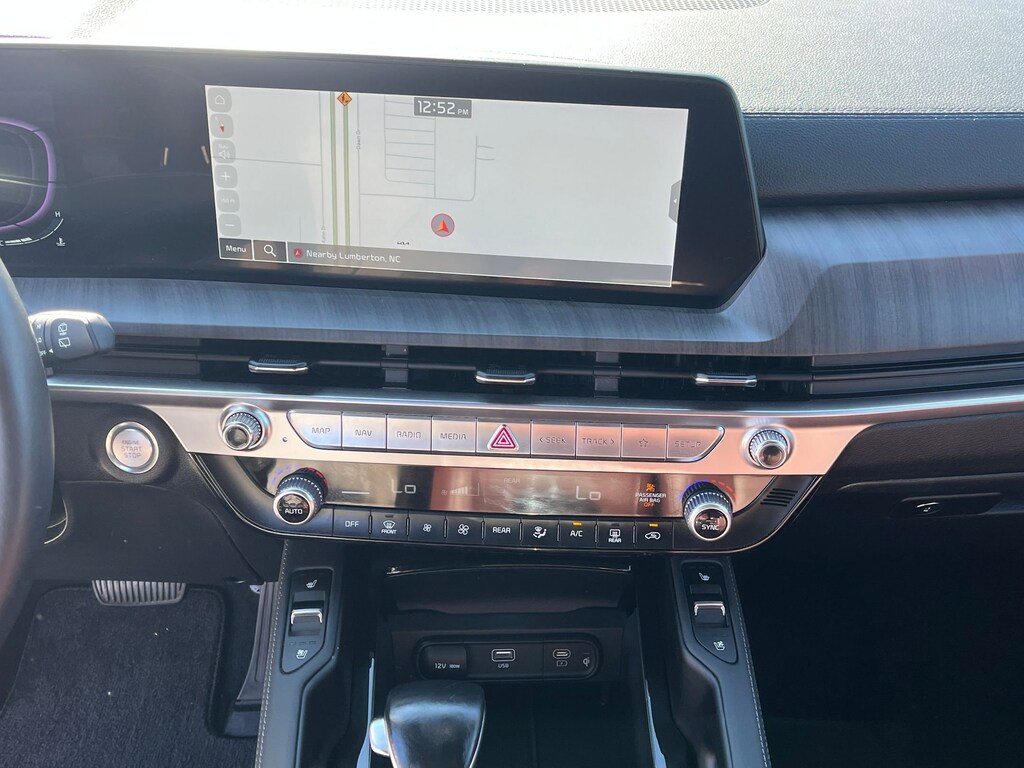This vehicle comes equipped with : EX Captain's Chair Package (2nd Row Captain Chairs), Mahogany Interior Color Package, Towing Package (Self Leveling Rear Suspension and Towing Hitch Standard), Kia Certified Pre-Owned Certified, 3.510 Axle Ratio, 3rd row seats: split-bench, 4-Wheel Disc Brakes, 6 Speakers, ABS brakes, Air Conditioning, Alloy wheels, AM/FM radio: SiriusXM, Apple CarPlay & Android Auto, Auto High-beam Headlights, Auto-dimming Rear-View mirror, Automatic temperature control, Brake assist, Bumpers: body-color, Carpet Floor Mats, Compass, Delay-off headlights, Driver door bin, Driver vanity mirror, Dual front impact airbags, Dual front side impact airbags, Electronic Stability Control, Emergency communication system: 911 Connect, Exterior Parking Camera Rear, Four wheel independent suspension, Front anti-roll bar, Front Bucket Seats, Front Center Armrest, Front dual zone A/C, Front reading lights, Fully automatic headlights, Heated & Ventilated Front Bucket Seats, Heated door mirrors, Heated front seats, Illuminated entry, Knee airbag, Leather Seat Trim, Leather Shift Knob, Leather steering wheel, Low tire pressure warning, Navigation System, Occupant sensing airbag, Outside temperature display, Overhead airbag, Overhead console, Panic alarm, Passenger door bin, Passenger vanity mirror, Power door mirrors, Power driver seat, Power Liftgate, Power moonroof, Power passenger seat, Power steering, Power windows, Radio data system, Radio: AM/FM Display Audio System, Rear air conditioning, Rear anti-roll bar, Rear audio controls, Rear reading lights, Rear seat center armrest, Rear side impact airbag, Rear window defroster, Rear window wiper, Reclining 3rd row seat, Remote keyless entry, Roof rack: rails only, Security system, Smart Key w/ Push Button and Remote Start, Speed control, Speed-sensing steering, Split folding rear seat, Spoiler, Steering wheel mounted audio controls, Tachometer, Telescoping steering wheel, Tilt steering wheel, Traction control, Trip computer, Turn signal indicator mirrors, Variably intermittent wipers, Ventilated front seats, and Wheels: 20" x 7.5" Black Finish.