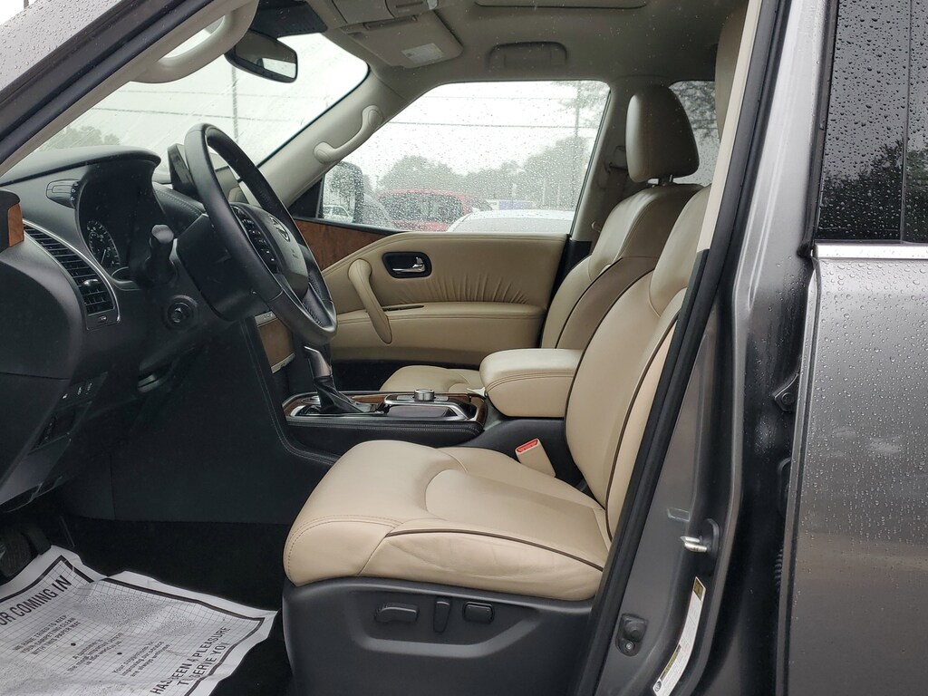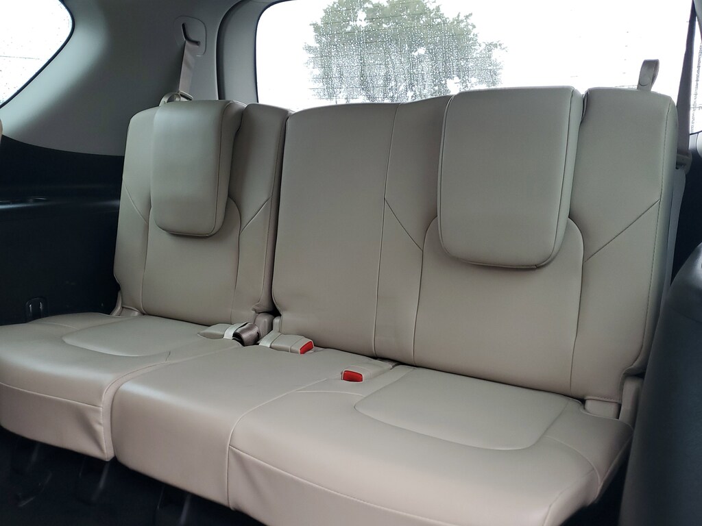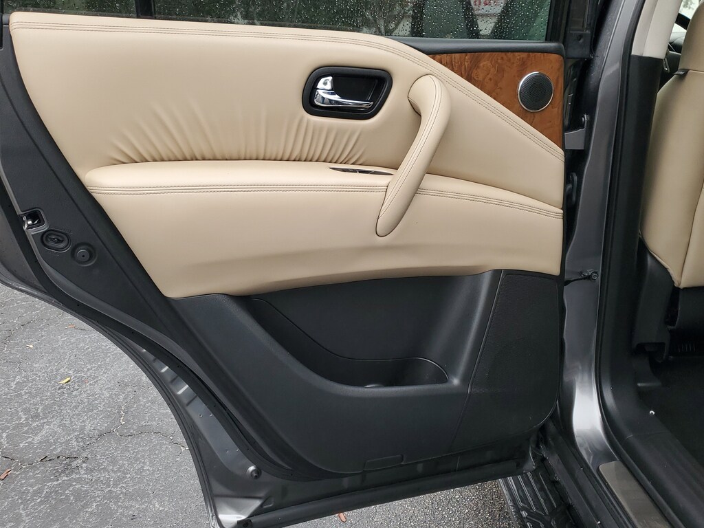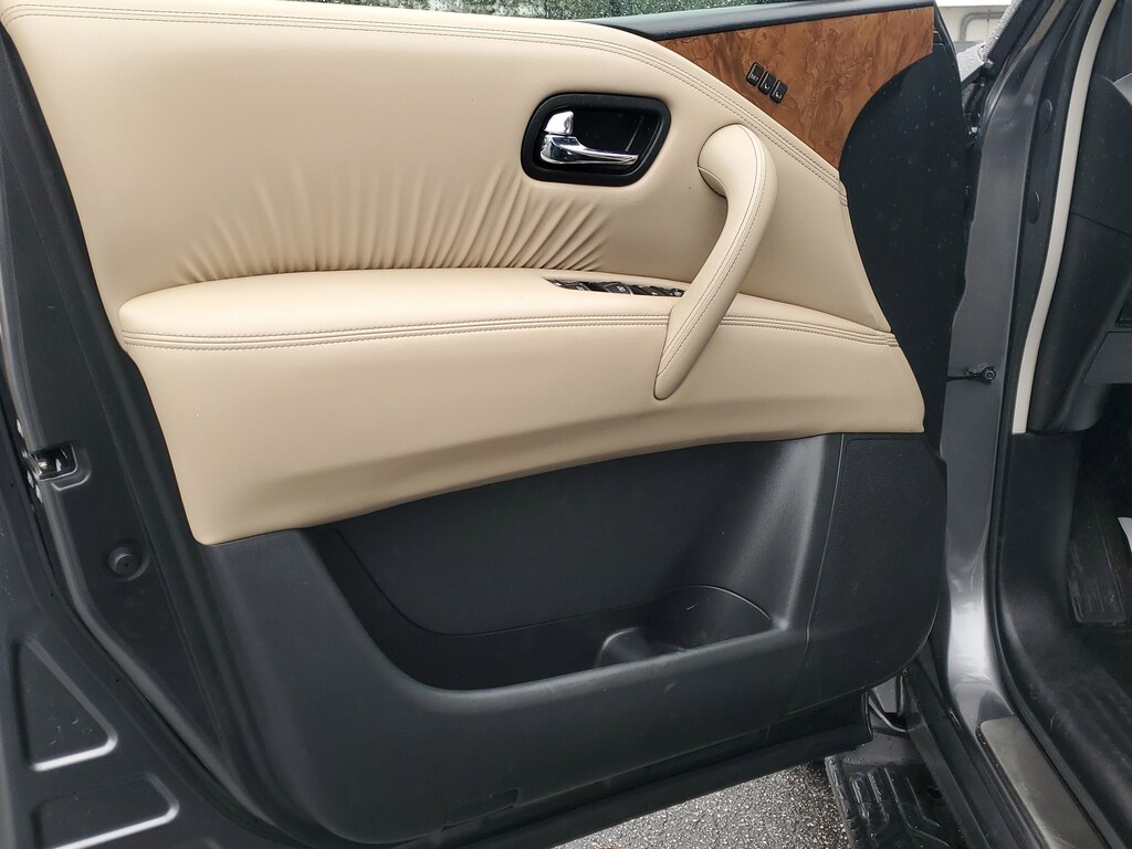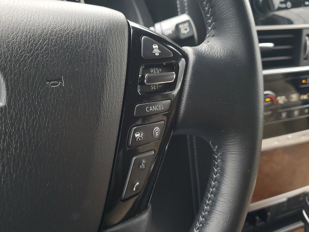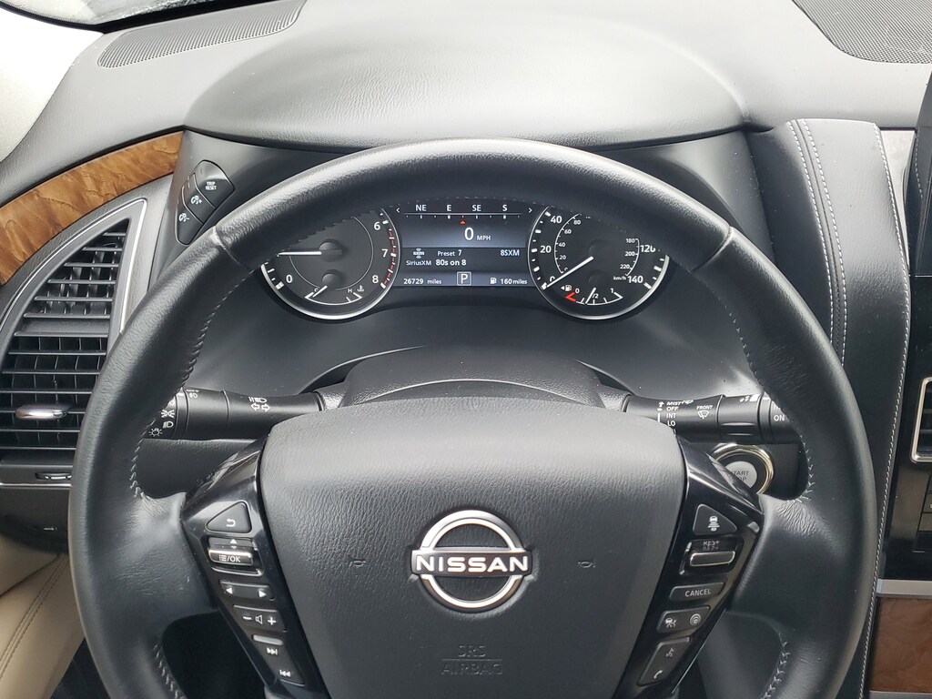 THIS VEHICLE IS EQUIPT WITH THE FOLLOWING FEATURES AND OPTIONS: Cargo Package, 13 Speakers, 2.94 Axle Ratio, 3rd Row Carpeted Floor Mats - Bench Seat, 3rd row seats: split-bench, 4-Wheel Disc Brakes, ABS brakes, Air Conditioning, Alloy wheels, AM/FM radio: SiriusXM, Anti-whiplash front head restraints, Auto High-beam Headlights, Auto tilt-away steering wheel, Auto-dimming door mirrors, Auto-dimming Rear-View mirror, Auto-leveling suspension, Automatic temperature control, Bose 13-Speaker Premium Audio System, Brake assist, Bumpers: body-color, Cross Bars, Delay-off headlights, Driver door bin, Driver vanity mirror, Dual front impact airbags, Dual front side impact airbags, Electronic Stability Control, Emergency communication system: NissanConnect Services, Exterior Parking Camera Rear, Four wheel independent suspension, Front anti-roll bar, Front Bucket Seats, Front Center Armrest, Front dual zone A/C, Front fog lights, Front reading lights, Fully automatic headlights, Garage door transmitter: HomeLink, Heated door mirrors, Heated Front Bucket Seats, Heated front seats, Heated steering wheel, Illuminated entry, Illuminated Kick Plates, Knee airbag, Leather Shift Knob, Leather-Appointed Seat Trim, Low tire pressure warning, Memory seat, Navigation System, NissanConnect featuring Apple CarPlay and Android Auto, Occupant sensing airbag, Outside temperature display, Overhead airbag, Overhead console, Panic alarm, Passenger door bin, Passenger vanity mirror, Power door mirrors, Power driver seat, Power Liftgate, Power moonroof, Power passenger seat, Power steering, Power windows, Premium audio system: Bose, Radio: NissanConnect w/SiriusXM, Rear air conditioning, Rear anti-roll bar, Rear reading lights, Rear seat center armrest, Rear window defroster, Rear window wiper, Reclining 3rd row seat, Remote keyless entry, Security system, Speed control, Speed-sensing steering, Speed-Sensitive Wipers, Split folding rear seat, Spoiler, Steering wheel memory, Steering wheel mounted audio controls, Tachometer, Telescoping steering wheel, Tilt steering wheel, Traction control, Trip computer, Turn signal indicator mirrors, Variably intermittent wipers, Voltmeter, and Wheels: 20 x 8J Painted Alloy.
