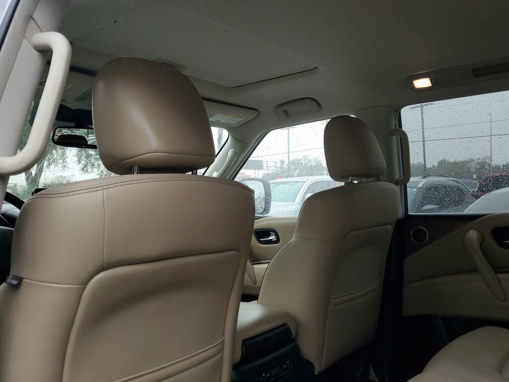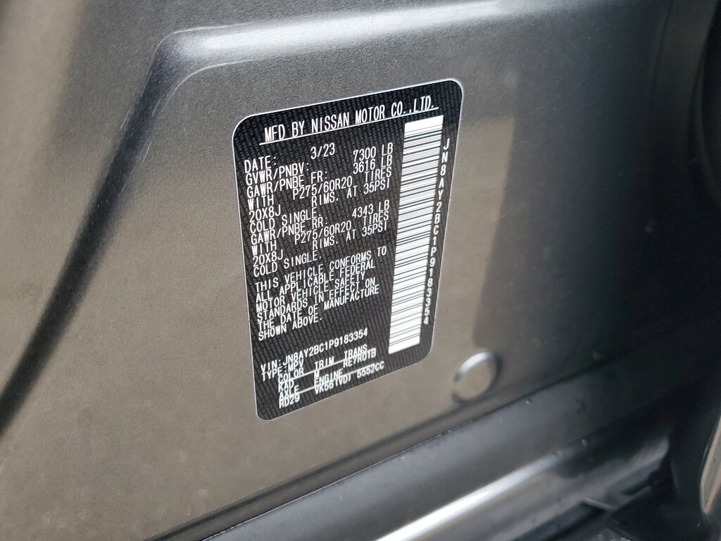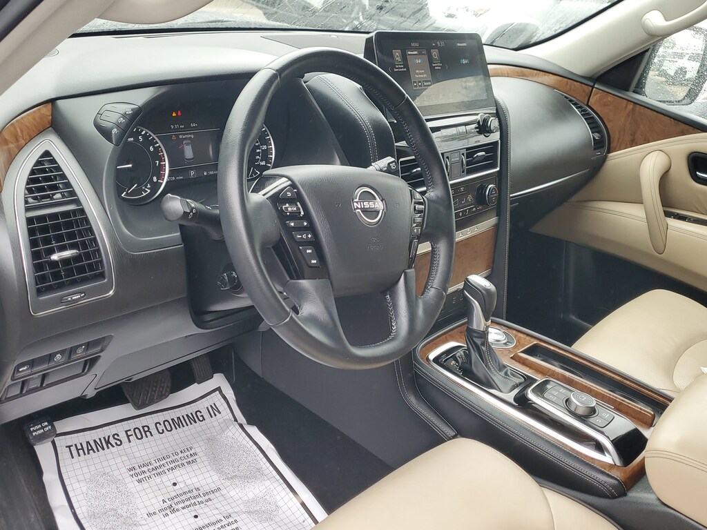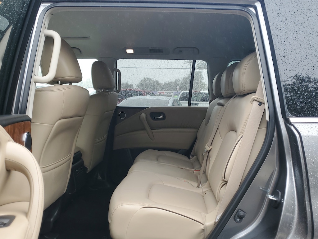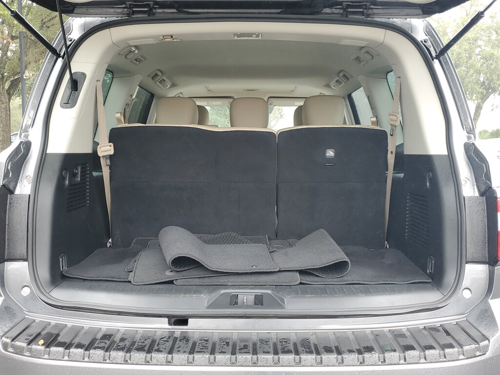 THIS VEHICLE IS EQUIPT WITH THE FOLLOWING FEATURES AND OPTIONS: Cargo Package, 13 Speakers, 2.94 Axle Ratio, 3rd Row Carpeted Floor Mats - Bench Seat, 3rd row seats: split-bench, 4-Wheel Disc Brakes, ABS brakes, Air Conditioning, Alloy wheels, AM/FM radio: SiriusXM, Anti-whiplash front head restraints, Auto High-beam Headlights, Auto tilt-away steering wheel, Auto-dimming door mirrors, Auto-dimming Rear-View mirror, Auto-leveling suspension, Automatic temperature control, Bose 13-Speaker Premium Audio System, Brake assist, Bumpers: body-color, Cross Bars, Delay-off headlights, Driver door bin, Driver vanity mirror, Dual front impact airbags, Dual front side impact airbags, Electronic Stability Control, Emergency communication system: NissanConnect Services, Exterior Parking Camera Rear, Four wheel independent suspension, Front anti-roll bar, Front Bucket Seats, Front Center Armrest, Front dual zone A/C, Front fog lights, Front reading lights, Fully automatic headlights, Garage door transmitter: HomeLink, Heated door mirrors, Heated Front Bucket Seats, Heated front seats, Heated steering wheel, Illuminated entry, Illuminated Kick Plates, Knee airbag, Leather Shift Knob, Leather-Appointed Seat Trim, Low tire pressure warning, Memory seat, Navigation System, NissanConnect featuring Apple CarPlay and Android Auto, Occupant sensing airbag, Outside temperature display, Overhead airbag, Overhead console, Panic alarm, Passenger door bin, Passenger vanity mirror, Power door mirrors, Power driver seat, Power Liftgate, Power moonroof, Power passenger seat, Power steering, Power windows, Premium audio system: Bose, Radio: NissanConnect w/SiriusXM, Rear air conditioning, Rear anti-roll bar, Rear reading lights, Rear seat center armrest, Rear window defroster, Rear window wiper, Reclining 3rd row seat, Remote keyless entry, Security system, Speed control, Speed-sensing steering, Speed-Sensitive Wipers, Split folding rear seat, Spoiler, Steering wheel memory, Steering wheel mounted audio controls, Tachometer, Telescoping steering wheel, Tilt steering wheel, Traction control, Trip computer, Turn signal indicator mirrors, Variably intermittent wipers, Voltmeter, and Wheels: 20 x 8J Painted Alloy.