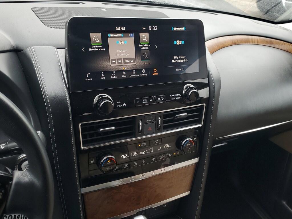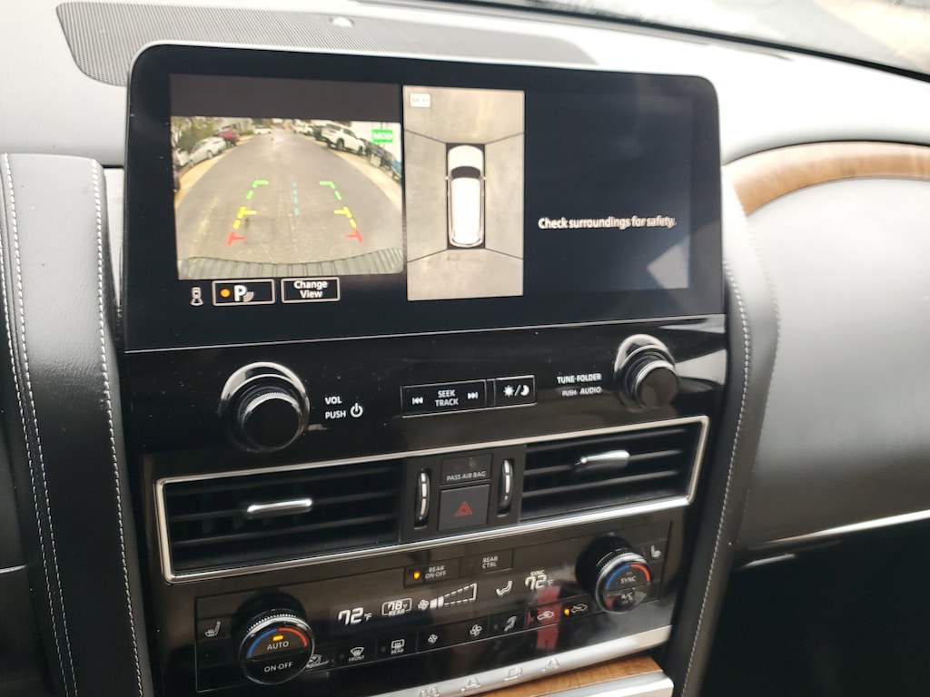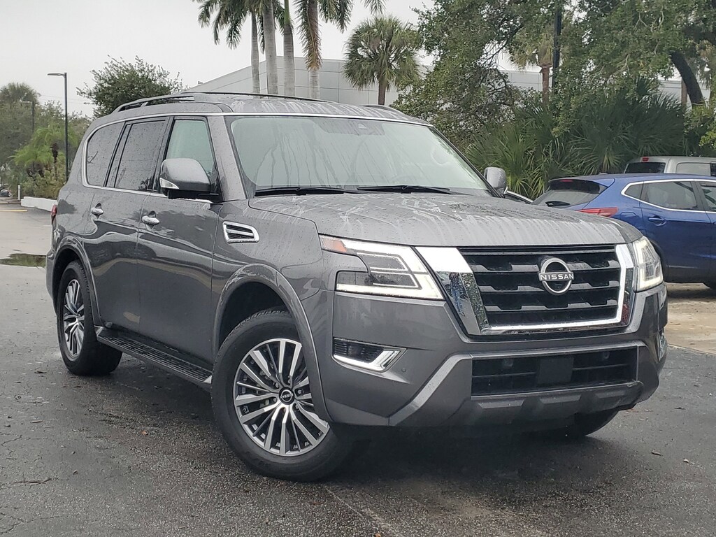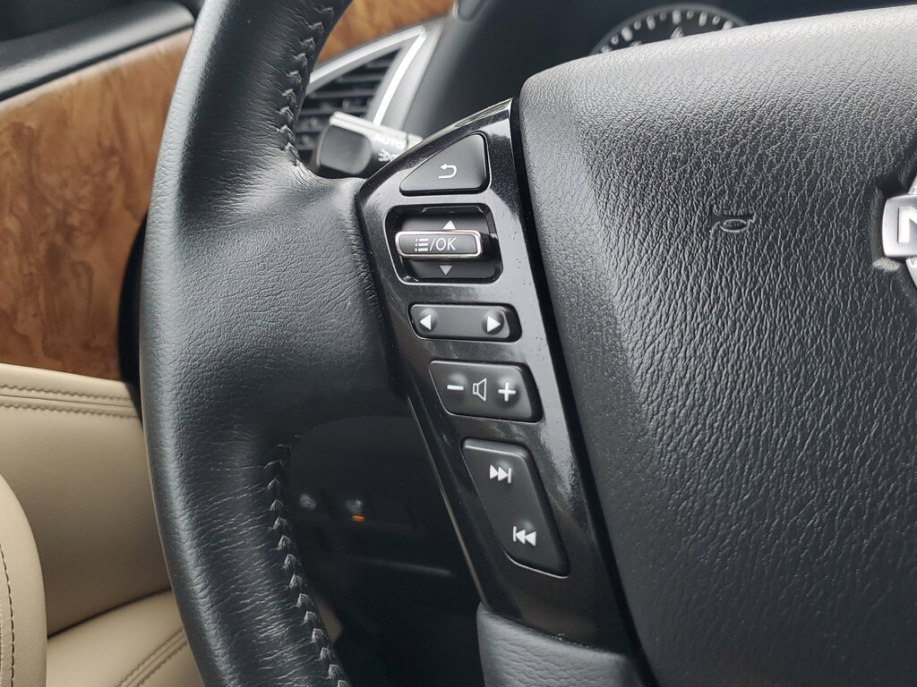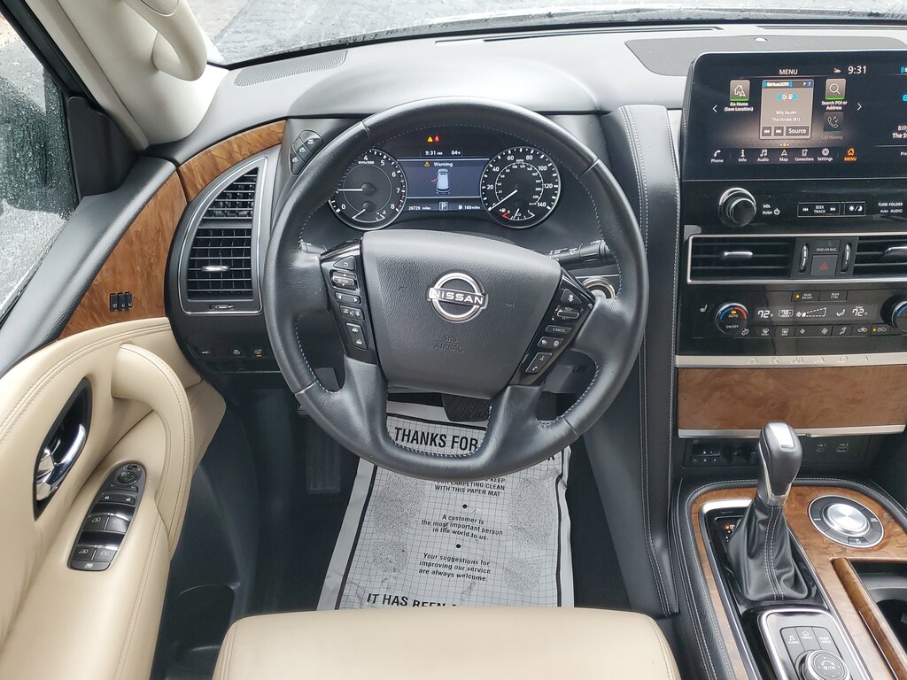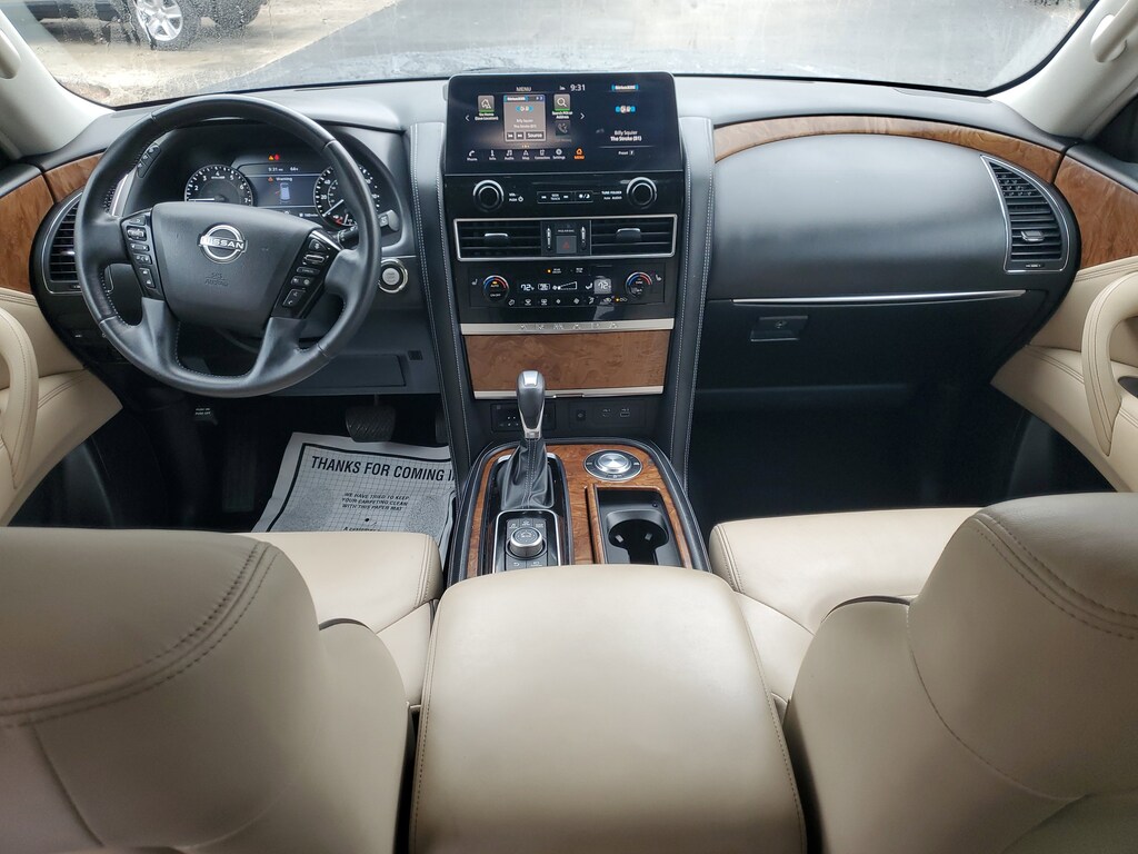 THIS VEHICLE IS EQUIPT WITH THE FOLLOWING FEATURES AND OPTIONS: Cargo Package, 13 Speakers, 2.94 Axle Ratio, 3rd Row Carpeted Floor Mats - Bench Seat, 3rd row seats: split-bench, 4-Wheel Disc Brakes, ABS brakes, Air Conditioning, Alloy wheels, AM/FM radio: SiriusXM, Anti-whiplash front head restraints, Auto High-beam Headlights, Auto tilt-away steering wheel, Auto-dimming door mirrors, Auto-dimming Rear-View mirror, Auto-leveling suspension, Automatic temperature control, Bose 13-Speaker Premium Audio System, Brake assist, Bumpers: body-color, Cross Bars, Delay-off headlights, Driver door bin, Driver vanity mirror, Dual front impact airbags, Dual front side impact airbags, Electronic Stability Control, Emergency communication system: NissanConnect Services, Exterior Parking Camera Rear, Four wheel independent suspension, Front anti-roll bar, Front Bucket Seats, Front Center Armrest, Front dual zone A/C, Front fog lights, Front reading lights, Fully automatic headlights, Garage door transmitter: HomeLink, Heated door mirrors, Heated Front Bucket Seats, Heated front seats, Heated steering wheel, Illuminated entry, Illuminated Kick Plates, Knee airbag, Leather Shift Knob, Leather-Appointed Seat Trim, Low tire pressure warning, Memory seat, Navigation System, NissanConnect featuring Apple CarPlay and Android Auto, Occupant sensing airbag, Outside temperature display, Overhead airbag, Overhead console, Panic alarm, Passenger door bin, Passenger vanity mirror, Power door mirrors, Power driver seat, Power Liftgate, Power moonroof, Power passenger seat, Power steering, Power windows, Premium audio system: Bose, Radio: NissanConnect w/SiriusXM, Rear air conditioning, Rear anti-roll bar, Rear reading lights, Rear seat center armrest, Rear window defroster, Rear window wiper, Reclining 3rd row seat, Remote keyless entry, Security system, Speed control, Speed-sensing steering, Speed-Sensitive Wipers, Split folding rear seat, Spoiler, Steering wheel memory, Steering wheel mounted audio controls, Tachometer, Telescoping steering wheel, Tilt steering wheel, Traction control, Trip computer, Turn signal indicator mirrors, Variably intermittent wipers, Voltmeter, and Wheels: 20 x 8J Painted Alloy.