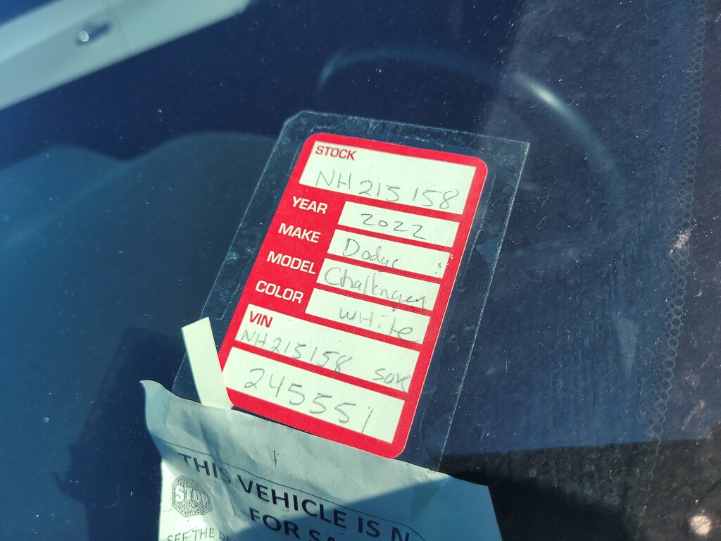 2022 Dodge Challenger SXT White Knuckle Clearcoat RWD 8-Speed Automatic 3.6L V6 24V VVT 4-Wheel Disc Brakes, ABS brakes, Apple CarPlay/Android Auto, Auto-dimming Rear-View mirror, Black Fuel Filler Door, Black Grille w/Bezel, Blacktop Package, Brake assist, Bumpers: body-color, Challenger Blacktop Grille Badge, Electronic Stability Control, Front dual zone A/C, Gloss Black I/P Cluster Trim Rings, GPS Navigation, Illuminated entry, Integrated Voice Command w/Bluetooth, Leather Performance Steering Wheel, Leather Shift Knob, ParkView Rear Back-Up Camera, Quick Order Package 2EA, Rear Black Spoiler, Remote keyless entry, Satin Black Dodge Tail Lamp Badge, Speed control, Steering wheel mounted audio controls, Traction control, Wheels: 20 x 8.0 Black Noise Painted.