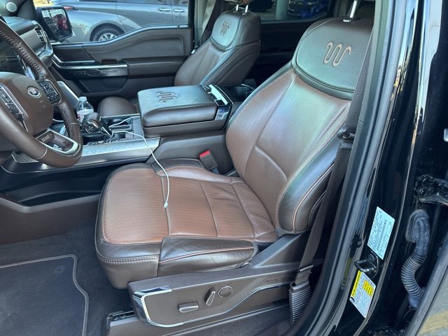 This vehicle comes equipped with: Bed Utility Package (BoxLink, LED Box Lighting, Power Tailgate, and Tailgate Step w/Tailgate Work Surface), Equipment Group 601A High (Multi-Contour Driver & Passenger Seats, Power-Deployable Running Boards, and Radio: B&O Unleashed Sound System by Bang & Olufsen), FX4 Off-Road Package (4x4 FX4 Off-Road Bodyside Decal, Electronic Locking w/3.31 Axle Ratio, Hill Descent Control, Monotube Rear Shocks, Off-Road Tuned Front Shock Absorbers, Rock Crawl Mode, and Tray Style Floor Liner), King Ranch Chrome Appearance Package (Bright Belt Moldings, Chrome Door Handles w/Body-Color Strap, Chrome Skull Caps on Exterior Mirrors, and Wheels: 20 Chrome-Like PVD), Max Trailer Tow Package (Class IV Trailer Hitch Receiver, Extended Range 36 Gallon Fuel Tank, Integrated Trailer Brake Controller, and Pro Trailer Backup Assist & Pro Trailer Hitch Assist), 3.5L PowerBoost Full-Hybrid V6, 4WD, 20 Machined-Aluminum Wheels, 3.31 Axle Ratio, 360 Degree Camera, 4-Wheel Disc Brakes, 8 Speakers, ABS brakes, Adjustable pedals, Air Conditioning, Alloy wheels, AM/FM radio: SiriusXM with 360L, Auto High-beam Headlights, Auto Start-Stop Removal (DISC), Auto tilt-away steering wheel, Auto-dimming door mirrors, Auto-dimming Rear-View mirror, Automatic temperature control, Brake assist, Center High-Mounted Stop Lamp CHMSL Camera Removal, Compass, Delay-off headlights, Driver door bin, Driver vanity mirror, Dual front impact airbags, Dual front side impact airbags, Electronic Locking w/3.73 Axle Ratio, Electronic Stability Control, Emergency communication system: SYNC 4 911 Assist, Exterior Parking Camera Rear, Front anti-roll bar, Front Bucket Seats, Front Center Armrest, Front dual zone A/C, Front fog lights, Front reading lights, Front wheel independent suspension, Fully automatic headlights, Garage door transmitter, Genuine wood console insert, Genuine wood dashboard insert, Genuine wood door panel insert, Heated door mirrors, Heated front seats, Heated rear seats, Heated steering wheel, Illuminated entry, Inclination/Intrusion Sensor Removal, Interior Work Surface, King Ranch Leather Bucket Seats, LED Sideview Mirror Spotlights, Low tire pressure warning, Memory seat, Multicontour Seats w/Active Motion Removal, Occupant sensing airbag, Outside temperature display, Overhead airbag, Overhead console, Panic alarm, Passenger door bin, Passenger vanity mirror, Pedal memory, Power door mirrors, Power driver seat, Power passenger seat, Power steering, Power windows, Pro Power Onboard - 7.2KW, Radio data system, Radio: B&O Sound System by Bang & Olufsen, Rain sensing wipers, Rear reading lights, Rear seat center armrest, Rear step bumper, Rear window defroster, Remote keyless entry, Security system, Speed control, Speed-sensing steering, Split folding rear seat, Steering Wheel Heat Removal (DISC), Steering wheel memory, Steering wheel mounted audio controls, SYNC 4 w/Enhanced Voice Recognition, Tachometer, Telescoping steering wheel, Tilt steering wheel, Traction control, Trip computer, Turn signal indicator mirrors, Twin Panel Moonroof, Variably intermittent wipers, Ventilated front seats, and Voltmeter.