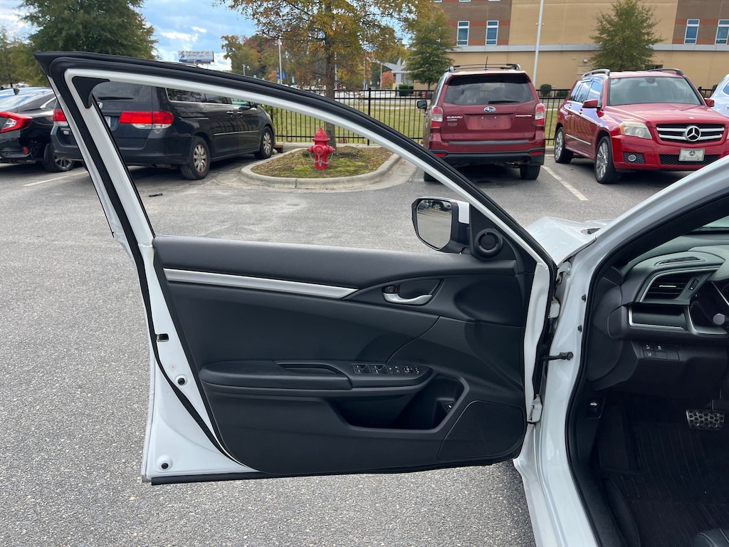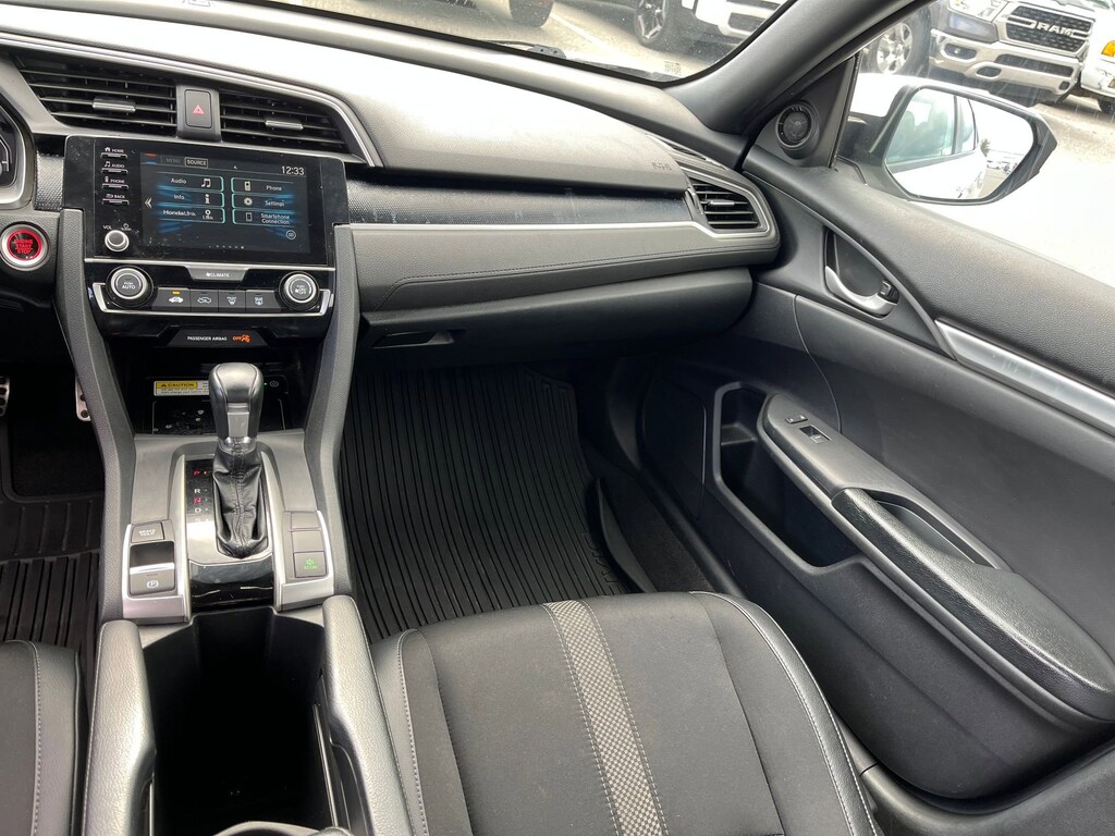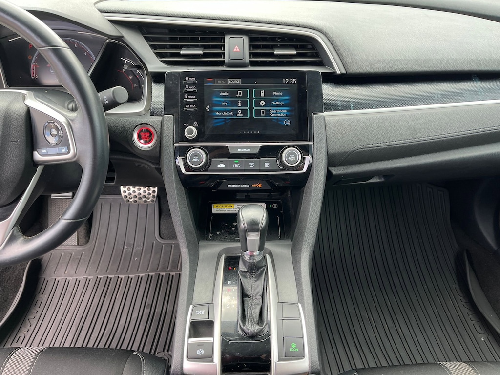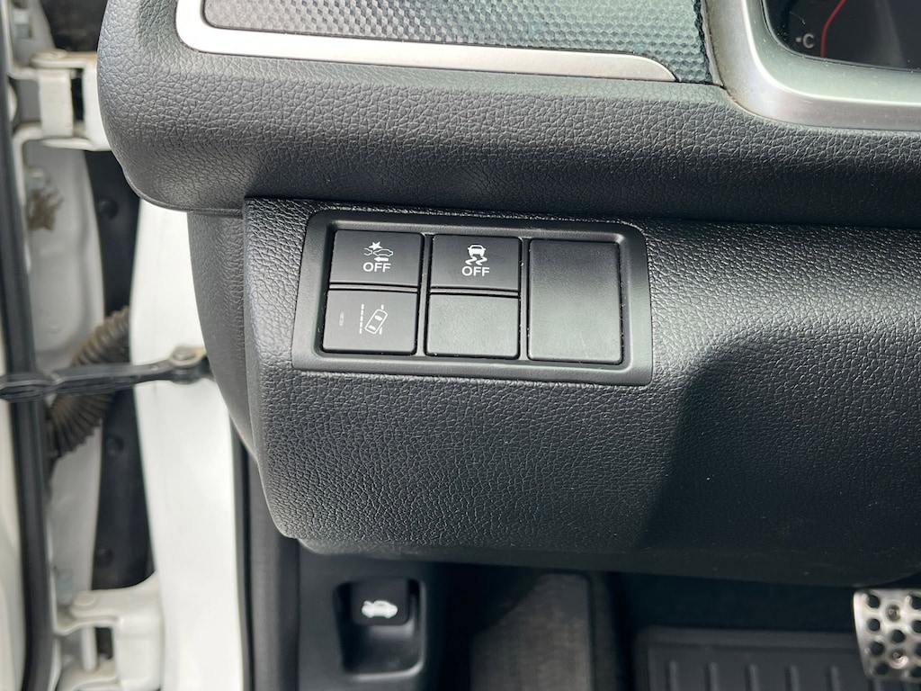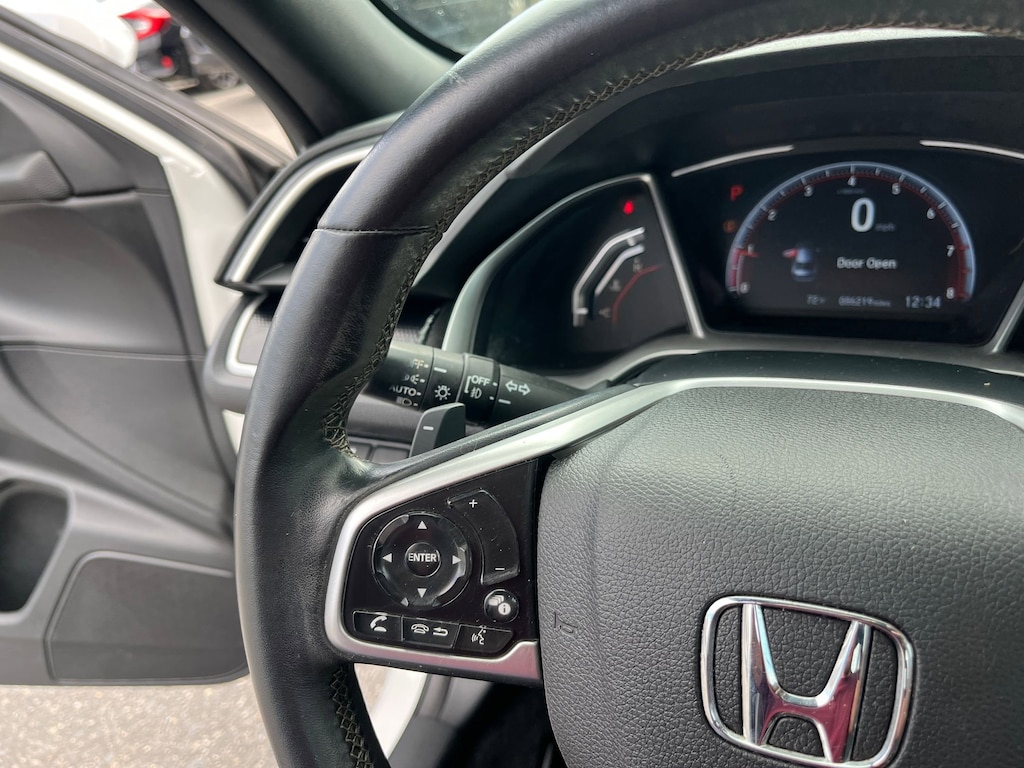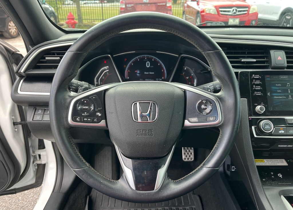 This vehicle comes equipped with : Black Cloth, 4-Wheel Disc Brakes, 8 Speakers, ABS brakes, Adaptive Cruise Control: Adaptive Cruise Control (ACC) with Low-Speed Follow, Air Conditioning, Alloy wheels, AM/FM radio, Apple CarPlay/Android Auto, Auto High-beam Headlights, Automatic temperature control, Brake assist, Bumpers: body-color, Cloth Seat Trim, Delay-off headlights, Driver door bin, Driver vanity mirror, Dual front impact airbags, Dual front side impact airbags, Electronic Stability Control, Emergency communication system: HondaLink, Exterior Parking Camera Rear, Forward collision: Collision Mitigation Braking System (CMBS) + FCW mitigation, Four wheel independent suspension, Front anti-roll bar, Front Bucket Seats, Front Center Armrest, Front fog lights, Front reading lights, Fully automatic headlights, Illuminated entry, Lane departure: Lane Keeping Assist System (LKAS) active, Leather Shift Knob, Low tire pressure warning, Occupant sensing airbag, Outside temperature display, Overhead airbag, Panic alarm, Passenger door bin, Passenger vanity mirror, Power door mirrors, Power steering, Power windows, Radio data system, Radio: 180-Watt AM/FM Audio System, Rear anti-roll bar, Rear window defroster, Remote keyless entry, Security system, Speed control, Speed-sensing steering, Split folding rear seat, Spoiler, Steering wheel mounted audio controls, Tachometer, Telescoping steering wheel, Tilt steering wheel, Traction control, Trip computer, and Wheels: 18" Alloy w/Gloss Black Inserts.