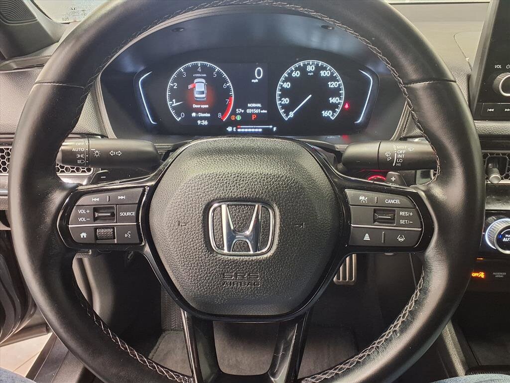 This vehicle comes equipped with: Black w/Cloth Seat Trim, 4-Wheel Disc Brakes, 8 Speakers, ABS brakes, Adaptive Cruise Control: Adaptive Cruise Control (ACC) with Low-Speed Follow, Air Conditioning, Alloy wheels, AM/FM radio, Apple CarPlay/Android Auto, Auto High-beam Headlights, Automatic temperature control, Brake assist, Bumpers: body-color, Cloth Seat Trim, Delay-off headlights, Driver door bin, Driver vanity mirror, Dual front impact airbags, Dual front side impact airbags, Electronic Stability Control, Emergency communication system: HondaLink, Exterior Parking Camera Rear, Forward collision: Collision Mitigation Braking System (CMBS) + FCW mitigation, Four wheel independent suspension, Front anti-roll bar, Front Bucket Seats, Front Center Armrest, Front reading lights, Fully automatic headlights, Illuminated entry, Knee airbag, Leather Shift Knob, Leather steering wheel, Low tire pressure warning, Occupant sensing airbag, Outside temperature display, Overhead airbag, Panic alarm, Passenger door bin, Passenger vanity mirror, Power door mirrors, Power steering, Power windows, Radio data system, Radio: 180-Watt AM/FM Audio System, Rear anti-roll bar, Rear side impact airbag, Rear window defroster, Remote keyless entry, Security system, Speed control, Speed-sensing steering, Steering wheel mounted audio controls, Tachometer, Telescoping steering wheel, Tilt steering wheel, Traction control, Trip computer, and Wheels: 18 Gloss Black Alloy.