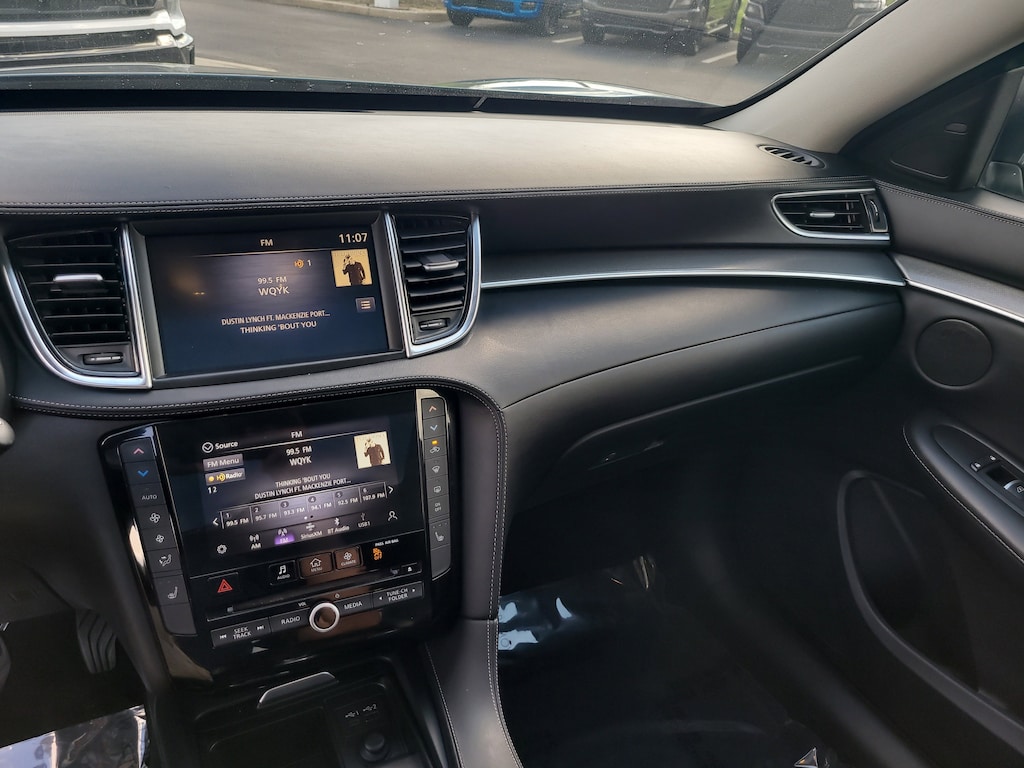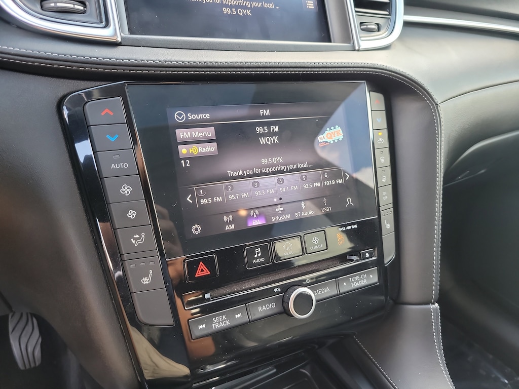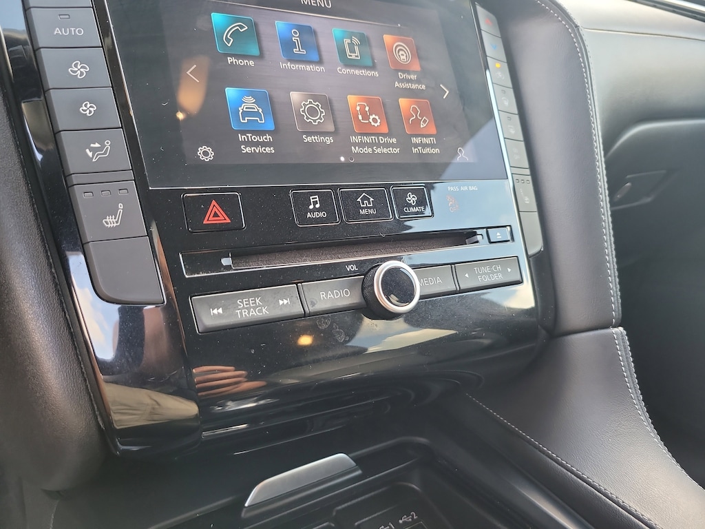 THIS VEHCILE INCLUDES THE FOLLOWING OPTIONS AND FEATURES: 4-Wheel Disc Brakes, 5.846 Axle Ratio, 6 Speakers, ABS brakes, Air Conditioning, Alloy wheels, AM/FM radio: SiriusXM, Anti-whiplash front head restraints, Auto High-beam Headlights, Auto-dimming Rear-View mirror, Automatic temperature control, Black Splash Guards (Set of 4), Brake assist, Bumpers: body-color, CD player, Delay-off headlights, Driver door bin, Driver vanity mirror, Dual front impact airbags, Dual front side impact airbags, Electronic Stability Control, Emergency communication system: INFINITI InTouch, Exterior Parking Camera Rear, Floor Mats, Four wheel independent suspension, Front anti-roll bar, Front Bucket Seats, Front Center Armrest, Front dual zone A/C, Front fog lights, Front reading lights, Fully automatic headlights, Garage door transmitter: HomeLink, Heated door mirrors, Heated Front Bucket Seats, Heated front seats, Illuminated entry, Illuminated Kick Plates, Knee airbag, Leather Shift Knob, Leather-Appointed Seat Trim, Low tire pressure warning, Occupant sensing airbag, Outside temperature display, Overhead airbag, Overhead console, Panic alarm, Passenger door bin, Passenger vanity mirror, Power door mirrors, Power driver seat, Power Liftgate, Power moonroof, Power passenger seat, Power steering, Power windows, Radio data system, Radio: HD Audio System, Rear anti-roll bar, Rear Parking Sensors, Rear reading lights, Rear seat center armrest, Rear side impact airbag, Rear window defroster, Rear window wiper, Remote keyless entry, Security system, Speed control, Speed-sensing steering, Speed-Sensitive Wipers, Split folding rear seat, Spoiler, Steering wheel mounted audio controls, Tachometer, Telescoping steering wheel, Tilt steering wheel, Traction control, Trip computer, Turn signal indicator mirrors, Variably intermittent wipers, Welcome Lighting, and Wheels: 19" Silver Painted Aluminum Alloy.