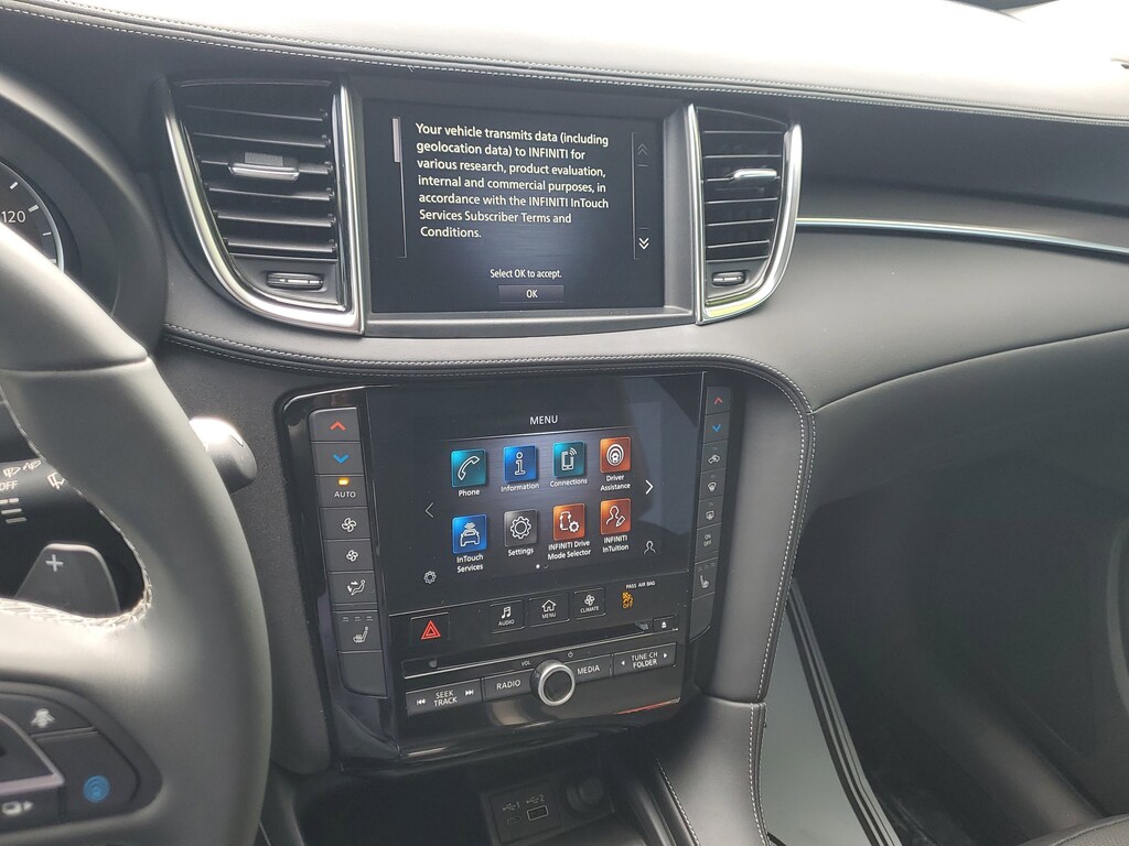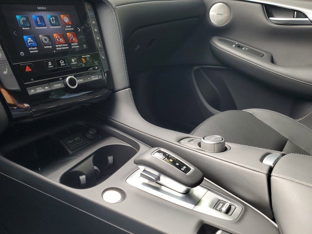 THIS VEHICLE IS EQUIPT WITH THE FOLLOWING FEATURES AND OPTIONS: 4-Wheel Disc Brakes, 5.846 Axle Ratio, 6 Speakers, ABS brakes, Air Conditioning, Alloy wheels, Aluminum Interior Accents, AM/FM radio: SiriusXM, Auto High-beam Headlights, Auto-dimming Rear-View mirror, Automatic temperature control, Bose 12-Speaker Premium Audio, Brake assist, Bumpers: body-color, CD player, Delay-off headlights, Driver door bin, Driver vanity mirror, Dual front impact airbags, Dual front side impact airbags, Electronic Stability Control, Emergency communication system: INFINITI InTouch (1-year complimentary trial), Exterior Parking Camera Rear, Floor Mats, Four wheel independent suspension, Front anti-roll bar, Front Bucket Seats, Front Center Armrest, Front dual zone A/C, Front reading lights, Fully automatic headlights, Garage door transmitter: HomeLink, Heated door mirrors, Heated Front Bucket Seats, Heated front seats, Illuminated entry, Illuminated Kick Plates, Knee airbag, Leather Shift Knob, Leather steering wheel, Leather-Appointed Seat Trim, Literature Kit, Low tire pressure warning, Memory seat, Occupant sensing airbag, Outside temperature display, Overhead airbag, Overhead console, Panic alarm, Passenger door bin, Passenger vanity mirror, Power door mirrors, Power driver seat, Power Liftgate, Power moonroof, Power passenger seat, Power steering, Power windows, Radio data system, Radio: HD Audio System, Rear anti-roll bar, Rear Parking Sensors, Rear reading lights, Rear seat center armrest, Rear side impact airbag, Rear window defroster, Rear window wiper, Remote keyless entry, Security system, Speed control, Speed-sensing steering, Speed-Sensitive Wipers, Splash Guards (Set of 4), Split folding rear seat, Spoiler, Steering wheel mounted audio controls, Tachometer, Telescoping steering wheel, Tilt steering wheel, Traction control, Trip computer, Turn signal indicator mirrors, Variably intermittent wipers, and Wheels: 19 Silver Painted Aluminum Alloy.