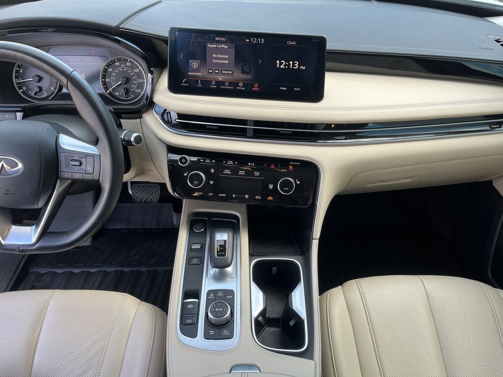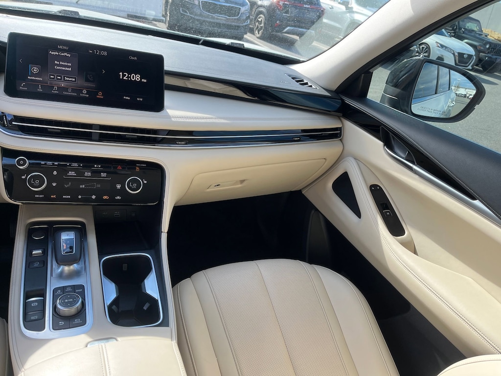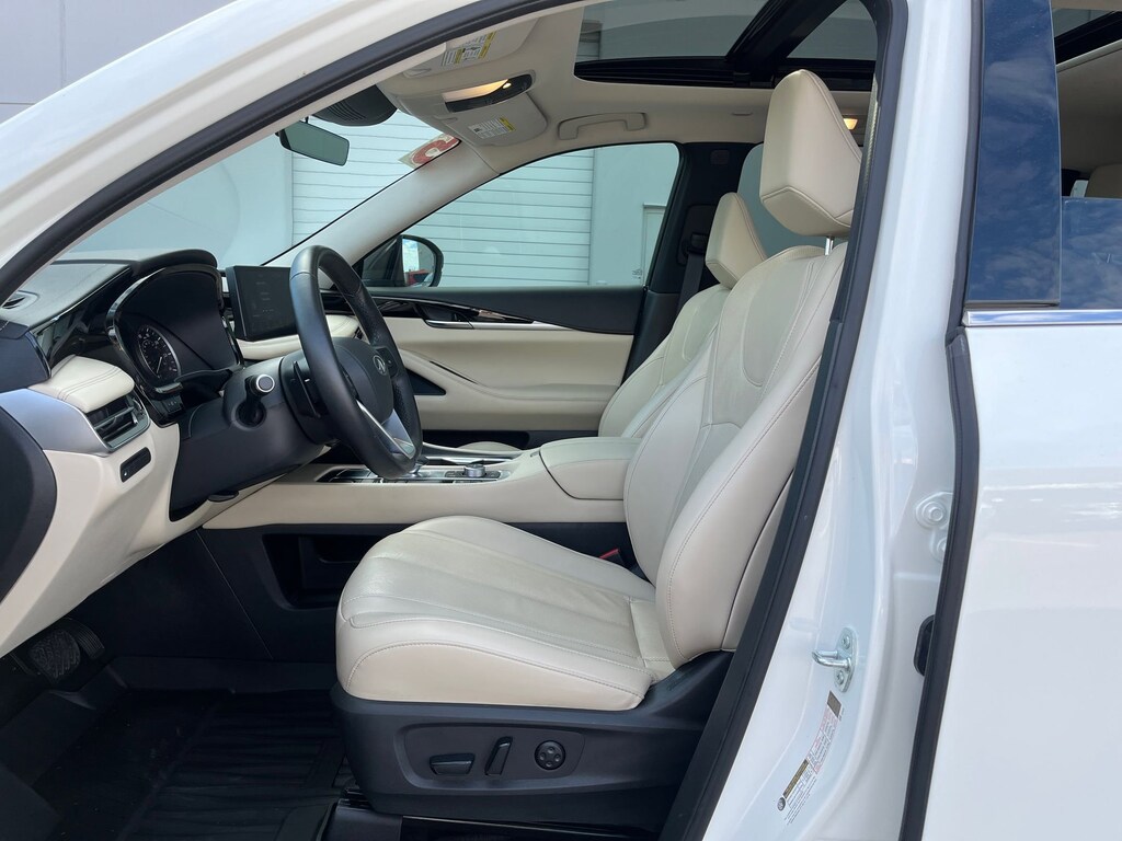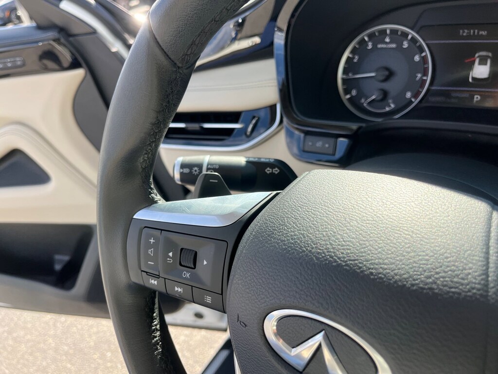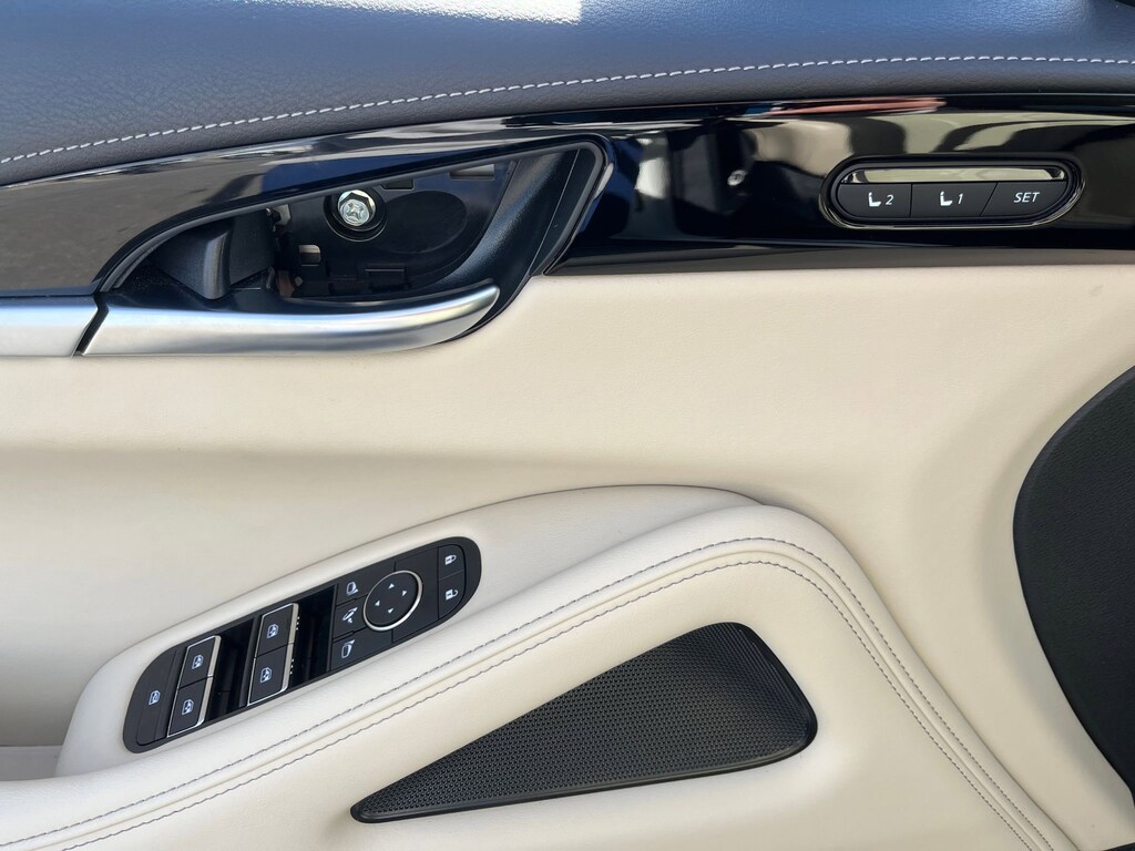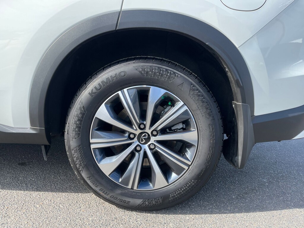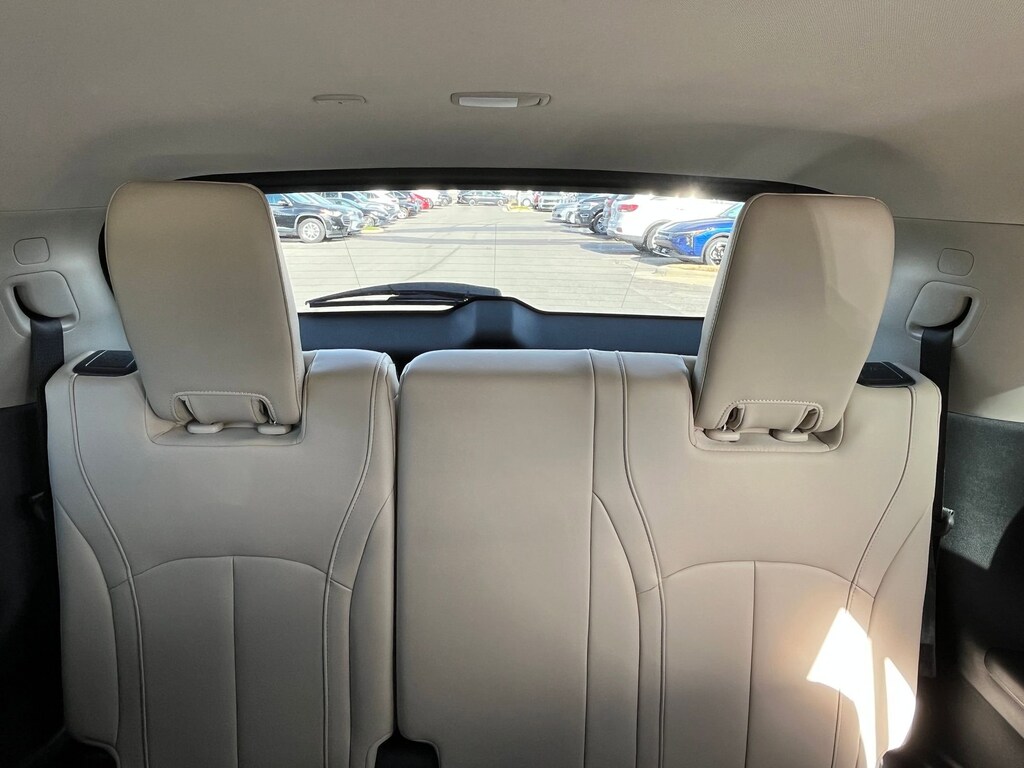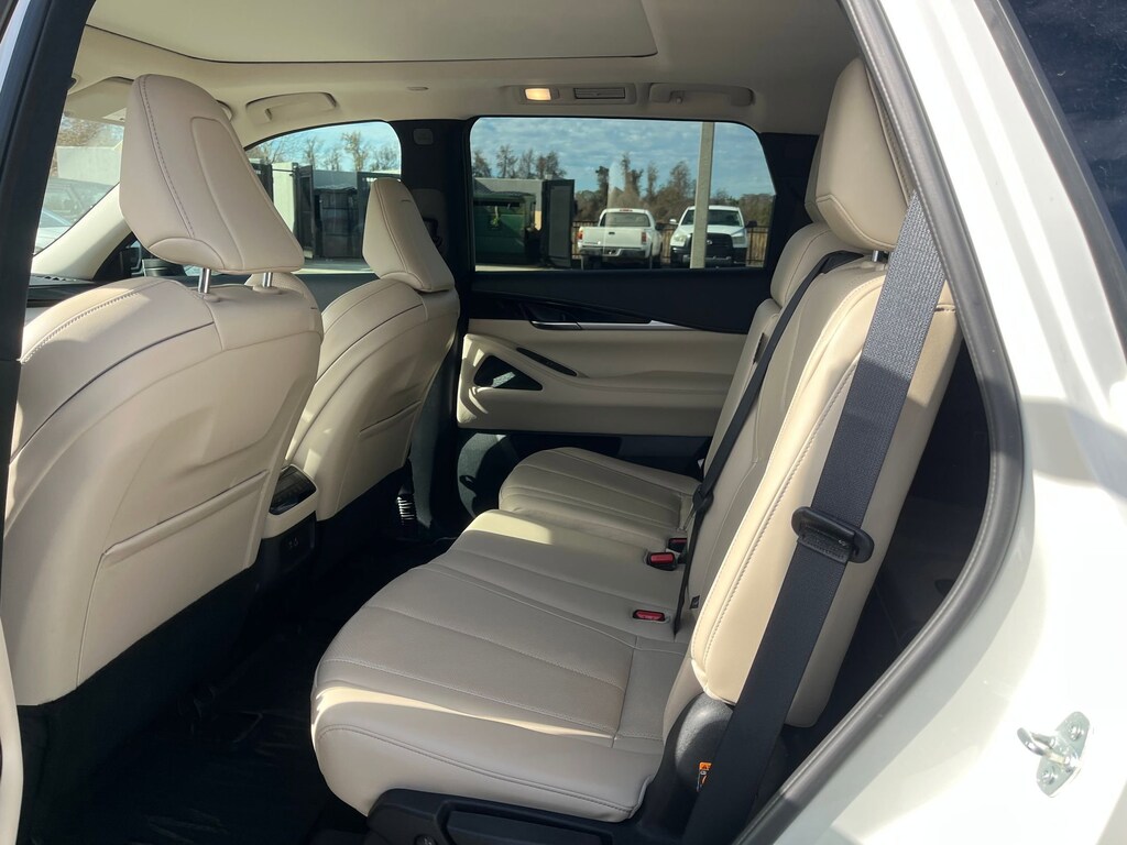 This vehicle comes equipped with : 3rd row seats: bench, 4-Wheel Disc Brakes, 9 Speakers, ABS brakes, Air Conditioning, Alloy wheels, AM/FM radio: SiriusXM, Anti-whiplash front head restraints, Apple CarPlay/Android Auto, Auto High-beam Headlights, Auto-dimming Rear-View mirror, Automatic temperature control, Blind Spot Warning, Brake assist, Bumpers: body-color, Delay-off headlights, Driver door bin, Driver vanity mirror, Dual front impact airbags, Dual front side impact airbags, Electronic Stability Control, Emergency communication system: INFINITI InTouch, Floor Mats w/Bench Seats on 3rd Row Tray, Four wheel independent suspension, Front anti-roll bar, Front Bucket Seats, Front Center Armrest, Front dual zone A/C, Front reading lights, Fully automatic headlights, Heated door mirrors, Heated Front Bucket Seats, Heated front seats, Heated steering wheel, Illuminated entry, Knee airbag, Leather Shift Knob, Leather steering wheel, Leather-Appointed Seating Surfaces, Literature Kit, Low tire pressure warning, Memory seat, Occupant sensing airbag, Outside temperature display, Overhead airbag, Overhead console, Panic alarm, Passenger door bin, Passenger vanity mirror, Power door mirrors, Power driver seat, Power Liftgate, Power moonroof, Power passenger seat, Power steering, Power windows, Radio data system, Radio: AM/FM Audio System, Rain sensing wipers, Rear air conditioning, Rear anti-roll bar, Rear Parking Sensors, Rear reading lights, Rear seat center armrest, Rear side impact airbag, Rear window defroster, Rear window wiper, Reclining 3rd row seat, Remote keyless entry, Security system, Speed control, Speed-sensing steering, Speed-Sensitive Wipers, Splash Guards, Split folding rear seat, Spoiler, Steering wheel mounted audio controls, Tachometer, Telescoping steering wheel, Tilt steering wheel, Traction control, Trip computer, Turn signal indicator mirrors, Variably intermittent wipers, and Wheels: 18" x 8J Machined Aluminum Alloy.