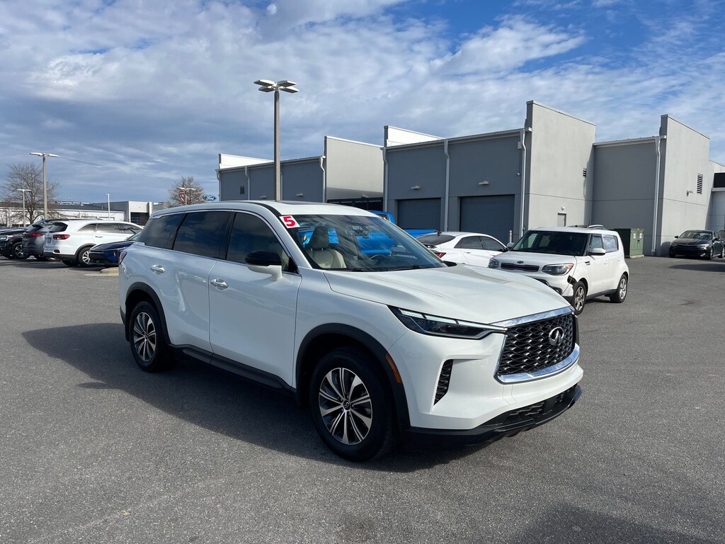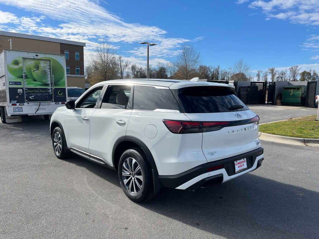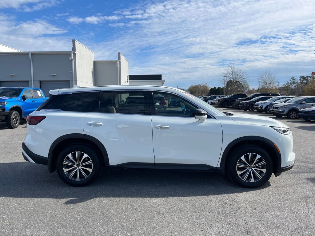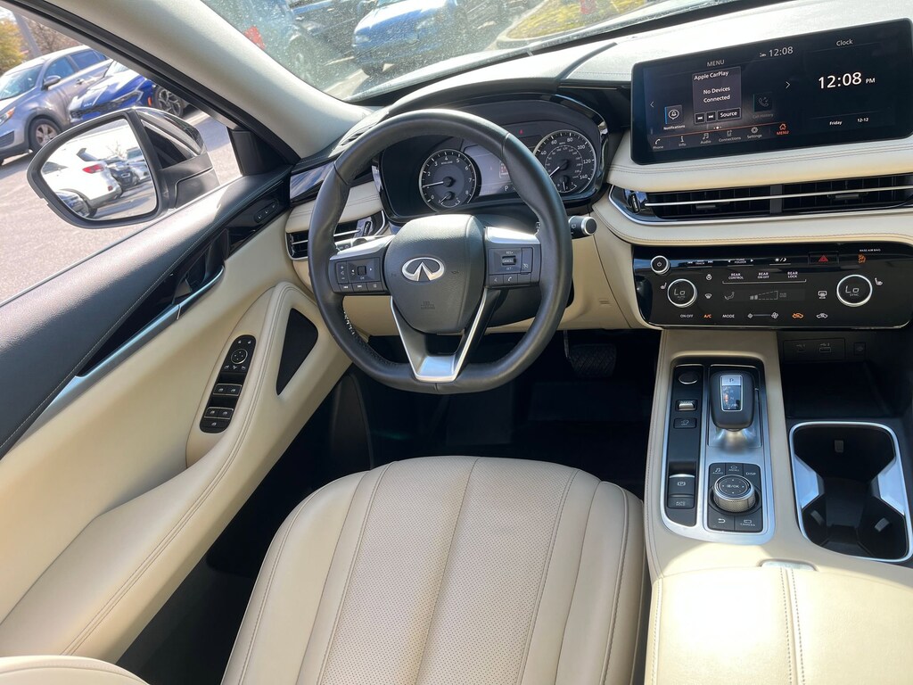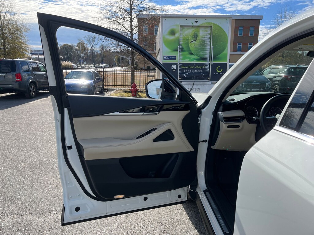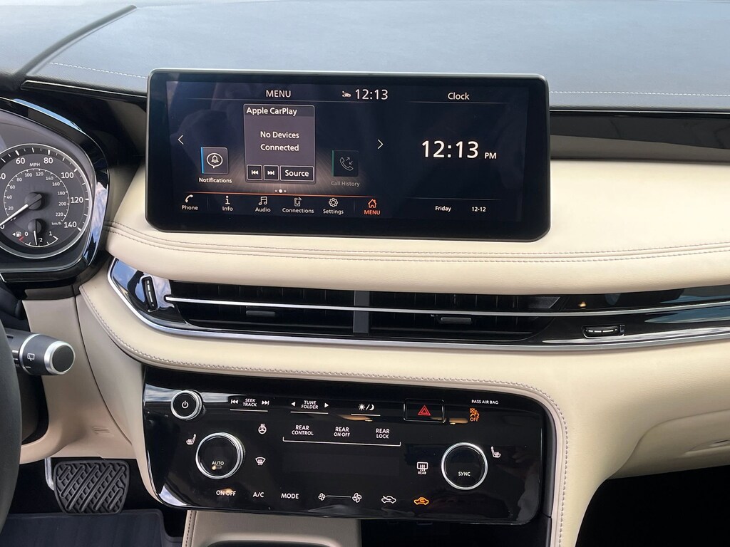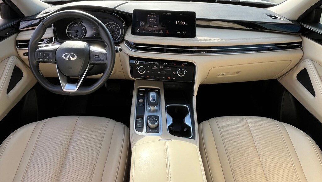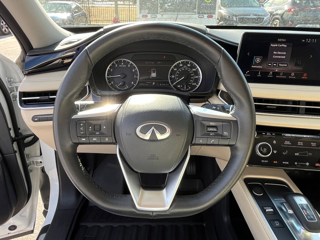 This vehicle comes equipped with : 3rd row seats: bench, 4-Wheel Disc Brakes, 9 Speakers, ABS brakes, Air Conditioning, Alloy wheels, AM/FM radio: SiriusXM, Anti-whiplash front head restraints, Apple CarPlay/Android Auto, Auto High-beam Headlights, Auto-dimming Rear-View mirror, Automatic temperature control, Blind Spot Warning, Brake assist, Bumpers: body-color, Delay-off headlights, Driver door bin, Driver vanity mirror, Dual front impact airbags, Dual front side impact airbags, Electronic Stability Control, Emergency communication system: INFINITI InTouch, Floor Mats w/Bench Seats on 3rd Row Tray, Four wheel independent suspension, Front anti-roll bar, Front Bucket Seats, Front Center Armrest, Front dual zone A/C, Front reading lights, Fully automatic headlights, Heated door mirrors, Heated Front Bucket Seats, Heated front seats, Heated steering wheel, Illuminated entry, Knee airbag, Leather Shift Knob, Leather steering wheel, Leather-Appointed Seating Surfaces, Literature Kit, Low tire pressure warning, Memory seat, Occupant sensing airbag, Outside temperature display, Overhead airbag, Overhead console, Panic alarm, Passenger door bin, Passenger vanity mirror, Power door mirrors, Power driver seat, Power Liftgate, Power moonroof, Power passenger seat, Power steering, Power windows, Radio data system, Radio: AM/FM Audio System, Rain sensing wipers, Rear air conditioning, Rear anti-roll bar, Rear Parking Sensors, Rear reading lights, Rear seat center armrest, Rear side impact airbag, Rear window defroster, Rear window wiper, Reclining 3rd row seat, Remote keyless entry, Security system, Speed control, Speed-sensing steering, Speed-Sensitive Wipers, Splash Guards, Split folding rear seat, Spoiler, Steering wheel mounted audio controls, Tachometer, Telescoping steering wheel, Tilt steering wheel, Traction control, Trip computer, Turn signal indicator mirrors, Variably intermittent wipers, and Wheels: 18" x 8J Machined Aluminum Alloy.