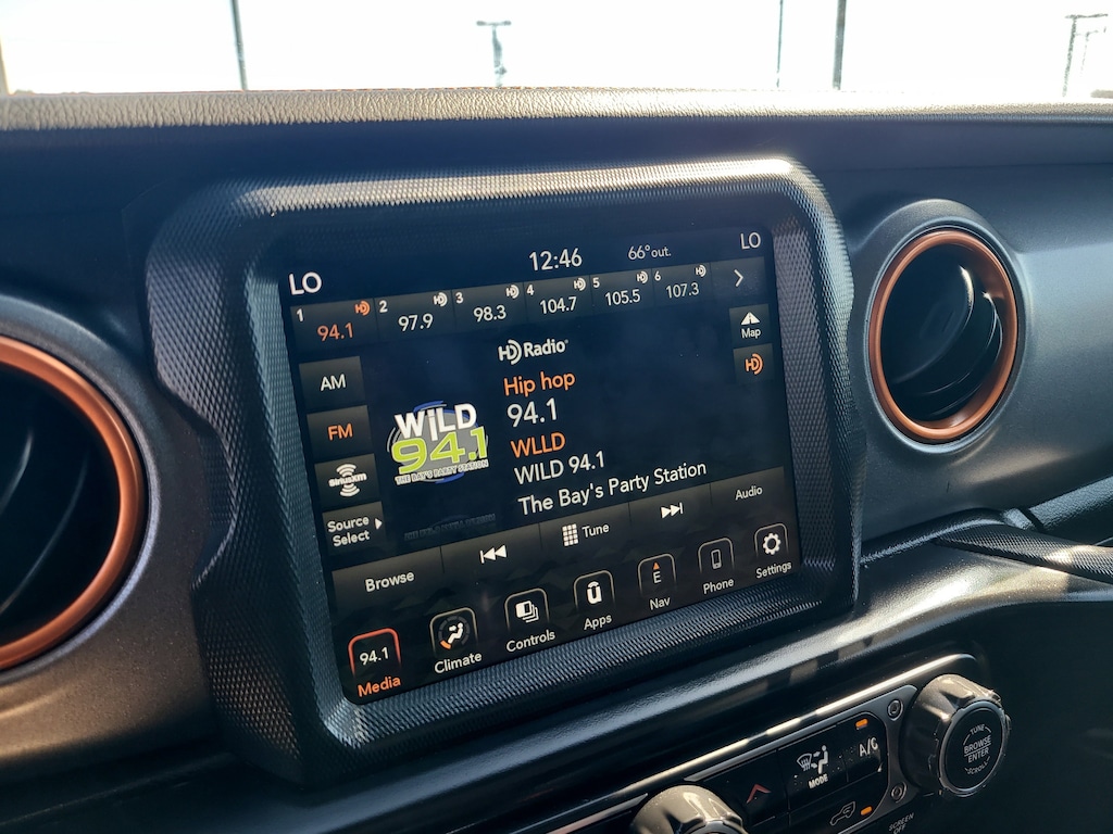 THIS VEHCILE INCLUDES THE FOLLOWING OPTIONS AND FEATURES: Auxiliary Switch Group (240 Amp Alternator, 700 Amp Maintenance Free Battery, and Auxiliary Switches), LED Lighting Group (Daytime Running Lamps LED Accents, Front LED Fog Lamps, LED Park Turn Lamps, LED Premium Reflector Headlamps, and LED Taillamps), Quick Order Package 24D, Trailer Tow Package (Class IV Receiver Hitch, Heavy-Duty Engine Cooling, and Trailer Hitch Zoom), 4-Wheel Disc Brakes, 4.10 Rear Axle Ratio, 9 Speakers, 97 MPH Vehicle Max Speed Calibration, ABS brakes, Air Conditioning, Alloy wheels, AM/FM radio: SiriusXM, Apple CarPlay/Android Auto, Auto-dimming Rear-View mirror, Automatic temperature control, Black 3-Piece Hard Top, Bluetooth Wireless Speaker, Brake assist, Compass, Corning Gorilla Glass, Delay-off headlights, Driver door bin, Driver vanity mirror, Dual front impact airbags, Dual front side impact airbags, Electronic Stability Control, Emergency communication system: SiriusXM Guardian, Freedom Panel Storage Bag, Front anti-roll bar, Front Bucket Seats, Front Center Armrest w/Storage, Front dual zone A/C, Front fog lights, Front reading lights, Fully automatic headlights, Garage door transmitter, Heated door mirrors, Heavy Duty Suspension w/Gas Shocks, Illuminated entry, Integrated roll-over protection, Leather steering wheel, Low tire pressure warning, MOPAR Spray In Bedliner, Navigation System, Occupant sensing airbag, Outside temperature display, Panic alarm, ParkView Rear Back-Up Camera, Passenger door bin, Passenger vanity mirror, Power door mirrors, Power steering, Power windows, Premium Cloth Seats w/Sport Bolsters, Radio data system, Radio: Uconnect 4C Nav w/8.4" Display, Rear anti-roll bar, Rear reading lights, Rear Sliding Window, Rear Window Defroster, Remote keyless entry, Security system, Speed control, Split folding rear seat, Steering wheel mounted audio controls, Tachometer, Telescoping steering wheel, Tilt steering wheel, Traction control, Trip computer, Variably intermittent wipers, Voltmeter, Wheels: 17" x 7.5" Low Gloss Black Aluminum, and Wheels: 17" x 7.5" Low Gloss Black Polished.