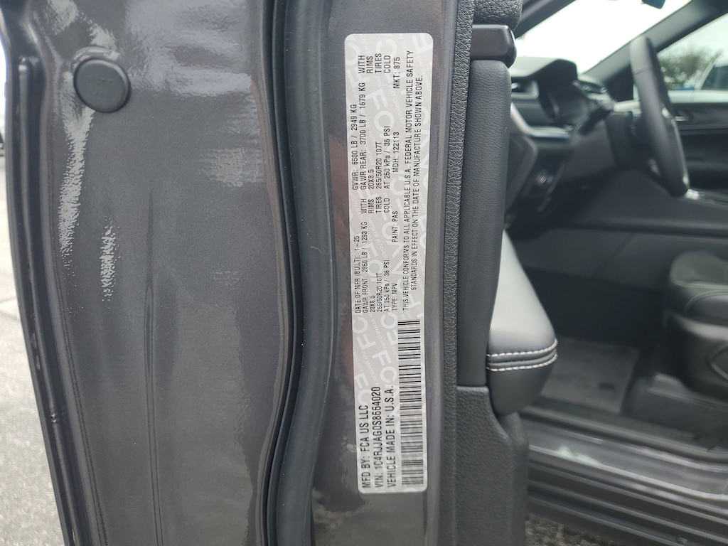 THIS VEHCILE INCLUDES THE FOLLOWING OPTIONS AND FEATURES: Altitude Appearance Package, Quick Order Package 23B Altitude (115V Auxiliary Power Outlet, 3rd Row Charge-Only USB Ports, Black Headliner, Capri Leatherette/Suede Seats, Delete Laredo Badge, Gloss Black Exterior Accents, Heated Front Seats, Heated Steering Wheel, Power Liftgate, Rain Sensitive Windshield Wipers, Remote Start System, Selectable Tire Fill Alert, Wheels: 18" x 8.0" Fully Painted Aluminum 1, and Wireless Charging Pad), 2nd Row 60/40 Bench w/Manual Tip/Slide, 2nd Row Seat Center Armrest/Cupholders, 3 Rear Seat Head Restraints, 3.45 Rear Axle Ratio, 3rd row seats: split-bench, 4-Wheel Disc Brakes, 6 Speakers, 7-Passenger Seating, ABS brakes, Air Conditioning, Alloy wheels, AM/FM radio: SiriusXM, Anti-whiplash front head restraints, Automatic temperature control, Brake assist, Bumpers: body-color, Center Rear 3-Point Seat Belt, Cloth Seats, Compass, Delay-off headlights, Driver door bin, Driver vanity mirror, Dual front impact airbags, Dual front side impact airbags, Electronic Stability Control, Emergency communication system, Four wheel independent suspension, Front anti-roll bar, Front Bucket Seats, Front Center Armrest w/Storage, Front dual zone A/C, Front reading lights, Fully automatic headlights, Heated door mirrors, Illuminated entry, Knee airbag, Low tire pressure warning, Manual Fold Seatbacks, Model Year Tracking, Normal Duty Suspension, Occupant sensing airbag, Outside temperature display, Overhead airbag, Overhead console, Panic alarm, ParkView Rear Back-Up Camera, Passenger door bin, Passenger vanity mirror, Power door mirrors, Power driver seat, Power steering, Power windows, Radio data system, Radio: Uconnect 5 w/8.4" Display, Rear air conditioning, Rear anti-roll bar, Rear reading lights, Rear window defroster, Rear window wiper, Reclining 3rd row seat, Remote keyless entry, Security system, Speed control, Speed-Sensitive Wipers, Split folding rear seat, Spoiler, Steering wheel mounted audio controls, Tachometer, Telescoping steering wheel, Tilt steering wheel, Traction control, Trip computer, Variably intermittent wipers, Voltmeter, Wheels: 18" x 8.0" Fully Painted Aluminum, and Wheels: 20" x 8.5" Gloss Black Painted Aluminum.