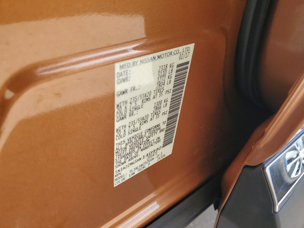 THIS VEHICLE IS EQUIPT WITH THE FOLLOWING FEATURES AND OPTIONS: Platinum Technology Package (Intelligent Cruise Control and Predictive Forward Collision Warning (PFCW)), 11 Speakers, 4-Wheel Disc Brakes, 4.677 Axle Ratio, ABS brakes, Air Conditioning, Alloy wheels, AM/FM radio: SiriusXM, Anti-whiplash front head restraints, Auto-dimming Rear-View mirror, Automatic temperature control, Blind Spot Warning, Brake assist, Bumpers: body-color, Carpeted Floor Mats & Cargo Mat, CD player, Compass, Delay-off headlights, Driver door bin, Driver vanity mirror, Dual front impact airbags, Dual front side impact airbags, Electronic Stability Control, Emergency communication system: NissanConnect Services, Four wheel independent suspension, Front anti-roll bar, Front Bucket Seats, Front Center Armrest w/Storage, Front dual zone A/C, Front fog lights, Front reading lights, Fully automatic headlights, Garage door transmitter: HomeLink, Heated & Cooled Front Bucket Seats, Heated door mirrors, Heated front seats, Heated rear seats, Heated steering wheel, Illuminated entry, Knee airbag, Leather Shift Knob, Leather-Appointed Seat Trim, Low tire pressure warning, Memory seat, Navigation System, NissanConnect Services Powered By SiriusXM, Occupant sensing airbag, Outside temperature display, Overhead airbag, Overhead console, Panic alarm, Passenger door bin, Passenger vanity mirror, Power door mirrors, Power driver seat, Power Liftgate, Power passenger seat, Power steering, Power windows, Radio data system, Radio: AM/FM/CD Audio System w/Navigation, Rear anti-roll bar, Rear reading lights, Rear seat center armrest, Rear window defroster, Rear window wiper, Remote keyless entry, Roof rack: rails only, Security system, Speed control, Speed-sensing steering, Speed-Sensitive Wipers, Splash Guards, Split folding rear seat, Spoiler, Steering wheel memory, Steering wheel mounted audio controls, Tachometer, Telescoping steering wheel, Tilt steering wheel, Traction control, Trip computer, Turn signal indicator mirrors, Variably intermittent wipers, Ventilated front seats, and Wheels: 20 Machined Aluminum-Alloy.