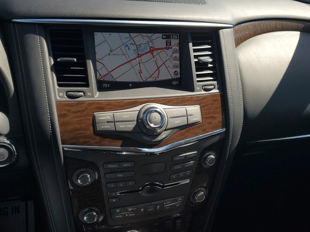 THIS VEHICLE IS EQUIPT WITH THE FOLLOWING FEATURES AND OPTIONS: 13 Speakers, 2.937 Axle Ratio, 3rd row seats: split-bench, 4-Wheel Disc Brakes, ABS brakes, Air Conditioning, Alloy wheels, AM/FM radio: SiriusXM, Anti-whiplash front head restraints, Auto tilt-away steering wheel, Auto-dimming door mirrors, Auto-dimming Rear-View mirror, Auto-leveling suspension, Automatic temperature control, Brake assist, Bumpers: body-color, CD player, Delay-off headlights, Driver door bin, Driver vanity mirror, Dual front impact airbags, Dual front side impact airbags, Electronic Stability Control, Emergency communication system: NissanConnect Services, Four wheel independent suspension, Front anti-roll bar, Front Bucket Seats, Front Center Armrest, Front dual zone A/C, Front fog lights, Front reading lights, Fully automatic headlights, Garage door transmitter: HomeLink, Heated door mirrors, Heated Front Bucket Seats w/Driver Memory, Heated front seats, Illuminated entry, Leather Shift Knob, Leather-Appointed Seat Trim, Low tire pressure warning, Memory seat, Navigation System, Occupant sensing airbag, Outside temperature display, Overhead airbag, Overhead console, Panic alarm, Passenger door bin, Passenger vanity mirror, Power door mirrors, Power driver seat, Power Liftgate, Power passenger seat, Power steering, Power windows, Radio data system, Radio: AM/FM/SXM/CD/MP3/HD, Rain sensing wipers, Rear air conditioning, Rear anti-roll bar, Rear reading lights, Rear seat center armrest, Rear window defroster, Rear window wiper, Reclining 3rd row seat, Remote keyless entry, Roof rack: rails only, Security system, Speed control, Speed-sensing steering, Speed-Sensitive Wipers, Split folding rear seat, Spoiler, Steering wheel memory, Steering wheel mounted audio controls, Tachometer, Telescoping steering wheel, Tilt steering wheel, Traction control, Trip computer, Turn signal indicator mirrors, Variably intermittent wipers, Voltmeter, and Wheels: 20 Machined Finish Painted Alloy.