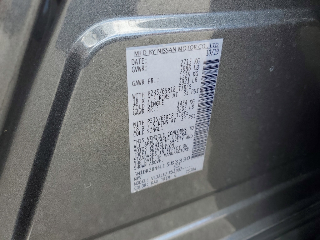 This Vehicle comes equipped with: 3rd row seats: bench, 4-Wheel Disc Brakes, 5.25 Axle Ratio, 6 Speakers, ABS brakes, Air Conditioning, Alloy wheels, AM/FM radio: SiriusXM, Auto-dimming Rear-View mirror, Automatic temperature control, Blind Spot Warning, Brake assist, Bumpers: body-color, Carpeted Floor Mats (4-pc Set), CD player, Cloth Seating Surfaces, Compass, Delay-off headlights, Driver door bin, Driver vanity mirror, Dual front impact airbags, Dual front side impact airbags, Electronic Stability Control, Four wheel independent suspension, Front anti-roll bar, Front Bucket Seats, Front Center Armrest, Front dual zone A/C, Front fog lights, Front reading lights, Fully automatic headlights, Garage door transmitter: HomeLink, Illuminated entry, Leather Shift Knob, Leather steering wheel, Low tire pressure warning, Occupant sensing airbag, Outside temperature display, Overhead airbag, Overhead console, Panic alarm, Passenger door bin, Passenger vanity mirror, Power door mirrors, Power driver seat, Power steering, Power windows, Radio data system, Radio: AM/FM/CD Audio System w/NissanConnect, Rear air conditioning, Rear anti-roll bar, Rear Parking Sensors, Rear reading lights, Rear seat center armrest, Rear window defroster, Rear window wiper, Reclining 3rd row seat, Remote keyless entry, Security system, Speed control, Speed-sensing steering, Speed-Sensitive Wipers, Split folding rear seat, Spoiler, Steering wheel mounted audio controls, Tachometer, Telescoping steering wheel, Tilt steering wheel, Traction control, Trip computer, Turn signal indicator mirrors, Variably intermittent wipers, and Wheels: 18" x 7.5 J Machined Aluminum-Alloy.