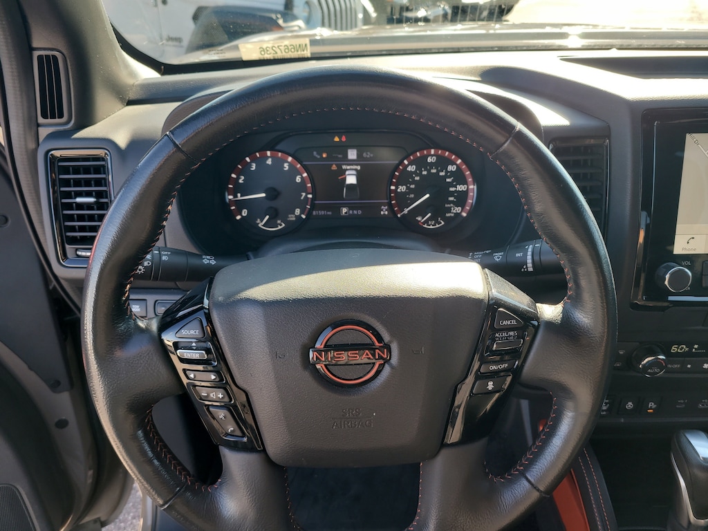 THIS VEHCILE INCLUDES THE FOLLOWING OPTIONS AND FEATURES: Off-Road Protection Package, PRO-4X Comfort & Convenience Package (Bed Under-Rail Lighting, Heated Steering Wheel, Intelligent Around View Monitor (I-AVM), and Wireless Charging For Personal Devices), 17" Alloy Wheels, 3.692 Axle Ratio, 4-Wheel Disc Brakes, 6 Speakers, ABS brakes, Air Conditioning, Alloy wheels, AM/FM radio: SiriusXM, Anti-whiplash front head restraints, Auto High-beam Headlights, Automatic temperature control, Brake assist, Bumpers: body-color, Delay-off headlights, Driver door bin, Driver vanity mirror, Dual front impact airbags, Dual front side impact airbags, Electronic Stability Control, Emergency communication system: NissanConnect Services, Front anti-roll bar, Front Bucket Seats, Front Center Armrest, Front dual zone A/C, Front fog lights, Front reading lights, Front wheel independent suspension, Fully automatic headlights, Illuminated entry, Knee airbag, Leather Shift Knob, Low tire pressure warning, Navigation system: Nissan Navigation with Voice Recognition, Occupant sensing airbag, Off-Road Style Step Rails, Overhead airbag, Overhead console, Panic alarm, Passenger door bin, Passenger vanity mirror, Power door mirrors, Power driver seat, Power steering, Power windows, PRO Embroidered Premium Cloth Seat Trim, PRO-4X Mud Flaps, Radio data system, Radio: SXM/AM/FM/AUX/USB Audio System w/6 Speakers, Rear anti-roll bar, Rear seat center armrest, Rear step bumper, Remote keyless entry, Security system, Speed control, Speed-sensing steering, Split folding rear seat, Steering wheel mounted audio controls, Tachometer, Tilt steering wheel, Traction control, Trip computer, Variably intermittent wipers, and Voltmeter.