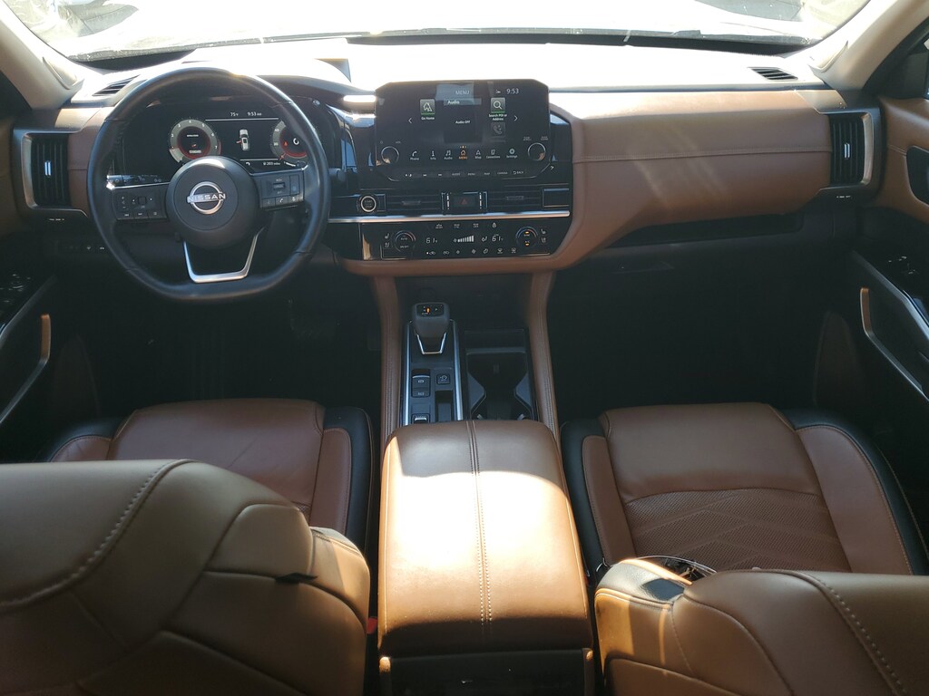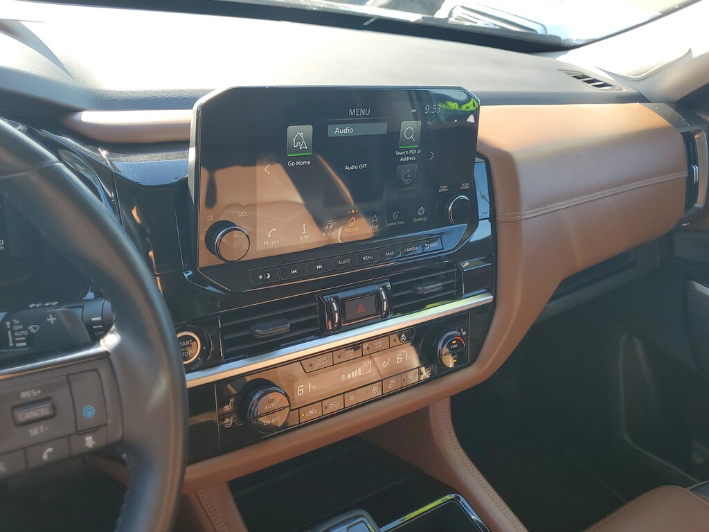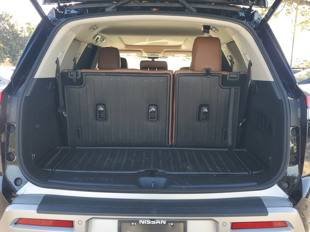 THIS VEHICLE IS EQUIPT WITH THE FOLLOWING FEATURES AND OPTIONS: Cargo Package (Cargo Area Protector, Cargo Net, and First Aid Kit), Platinum Bench Seat Package, Tow Delete Package (Delete Tow Hitch Receiver & Harness), 13 Speakers, 3rd row seats: bench, 4-Wheel Disc Brakes, ABS brakes, Air Conditioning, Alloy wheels, AM/FM radio: SiriusXM, Auto High-beam Headlights, Auto tilt-away steering wheel, Auto-dimming Rear-View mirror, Automatic temperature control, Axle Ratio: TBD, Bench Seat Carpeted Floor Mats (Set of 4), Black Splash Guards (Set of 4), Bodyside moldings, Bose Premium Audio System, Brake assist, Bumpers: body-color, Climate Controlled Front Bucket Seats, Delay-off headlights, Driver door bin, Driver vanity mirror, Dual front impact airbags, Dual front side impact airbags, Electronic Stability Control, Emergency communication system: NissanConnect Services, Exterior Parking Camera Rear, Four wheel independent suspension, Front anti-roll bar, Front Bucket Seats, Front Center Armrest, Front dual zone A/C, Front fog lights, Front reading lights, Fully automatic headlights, Garage door transmitter: HomeLink, Heads-Up Display, Heated door mirrors, Heated front seats, Heated rear seats, Heated steering wheel, Illuminated entry, Knee airbag, Leather steering wheel, Low tire pressure warning, Memory seat, Navigation system: NissanConnect Navigation, NissanConnect w/Navigation & Services, Occupant sensing airbag, Outside temperature display, Overhead airbag, Overhead console, Panic alarm, Passenger door bin, Passenger vanity mirror, Power door mirrors, Power driver seat, Power Liftgate, Power moonroof, Power passenger seat, Power steering, Power windows, Radio data system, Radio: AM/FM Audio System, Rain sensing wipers, Rear air conditioning, Rear anti-roll bar, Rear reading lights, Rear side impact airbag, Rear window defroster, Rear window wiper, Reclining 3rd row seat, Remote keyless entry, Security system, Semi-Aniline Leather Seating Surfaces, Speed control, Speed-sensing steering, Speed-Sensitive Wipers, Split folding rear seat, Spoiler, Steering wheel memory, Steering wheel mounted audio controls, Tachometer, Telescoping steering wheel, Tilt steering wheel, Traction control, Trip computer, Turn signal indicator mirrors, Variably intermittent wipers, Ventilated front seats, and Wheels: 20 Alloy w/Unique Finish.