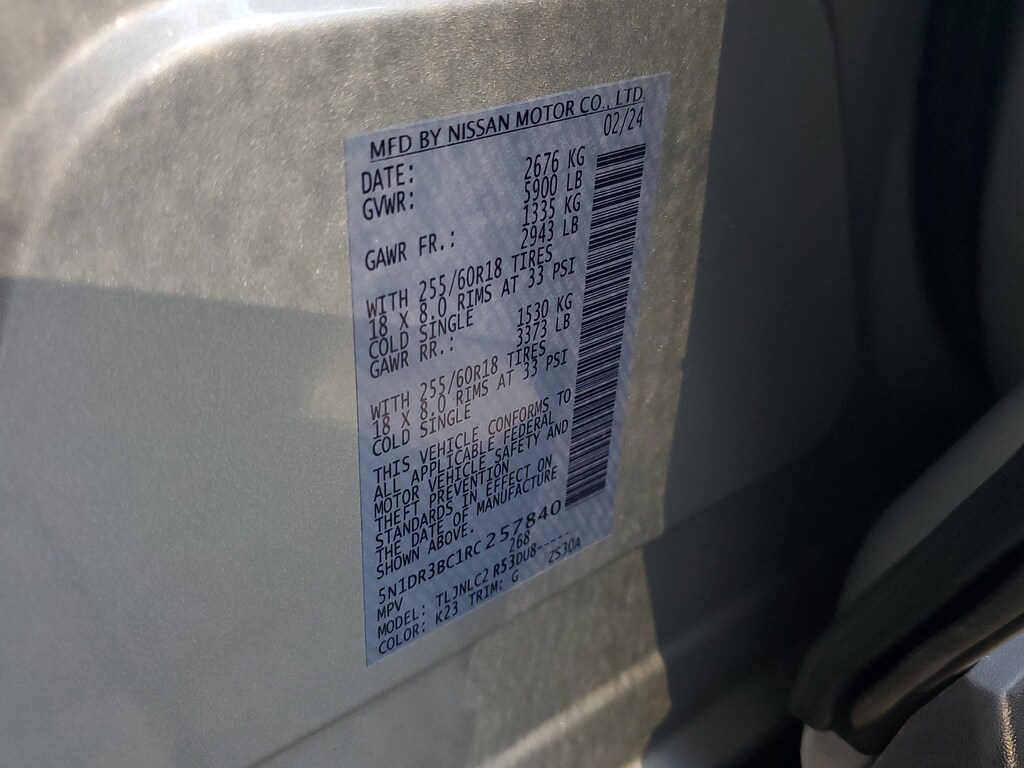 THIS VEHICLE IS EQUIPT WITH THE FOLLOWING FEATURES AND OPTIONS: 3rd row seats: bench, 4-Wheel Disc Brakes, 6 Speakers, ABS brakes, Air Conditioning, Alloy wheels, AM/FM radio: SiriusXM, Auto High-beam Headlights, Automatic temperature control, Axle Ratio: 4.334, Brake assist, Bumpers: body-color, Cloth Seating Surfaces, Delay-off headlights, Driver door bin, Driver vanity mirror, Dual front impact airbags, Dual front side impact airbags, Electronic Stability Control, Emergency communication system, Four wheel independent suspension, Front anti-roll bar, Front Bucket Seats, Front Center Armrest, Front dual zone A/C, Front reading lights, Fully automatic headlights, Heated door mirrors, Heated Front Bucket Seats, Heated front seats, Illuminated entry, Knee airbag, Leather steering wheel, Low tire pressure warning, NissanConnect featuring Apple CarPlay and Android Auto, Occupant sensing airbag, Outside temperature display, Overhead airbag, Overhead console, Panic alarm, Passenger door bin, Passenger vanity mirror, Power door mirrors, Power driver seat, Power steering, Power windows, Radio data system, Radio: AM/FM Audio System w/NissanConnect, Rear air conditioning, Rear anti-roll bar, Rear Parking Sensors, Rear reading lights, Rear seat center armrest, Rear side impact airbag, Rear window defroster, Rear window wiper, Reclining 3rd row seat, Remote keyless entry, Security system, Speed control, Speed-sensing steering, Split folding rear seat, Spoiler, Steering wheel mounted audio controls, Tachometer, Telescoping steering wheel, Tilt steering wheel, Traction control, Trip computer, Turn signal indicator mirrors, Variably intermittent wipers, and Wheels: 18 x 8J Painted Alloy.