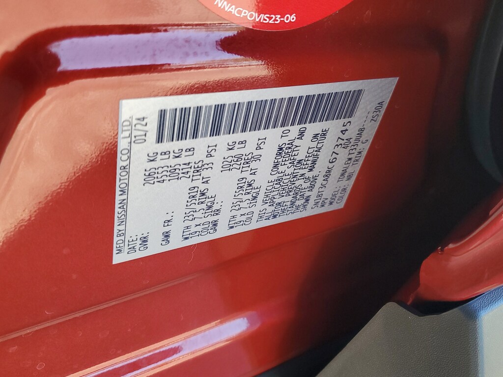 THIS VEHICLE IS EQUIPT WITH THE FOLLOWING FEATURES AND OPTIONS: SL Premium Package (Memory Driver Seat & Outside Mirrors, Motion-Activated Power Liftgate, Panoramic Moonroof, Rear Door Sunshades, Rear Personal Lights, Reverse Tilt-Down Outside Mirrors, and Tri-Zone Automatic Temperature Control), 4-Wheel Disc Brakes, 5.676 Axle Ratio, 6 Speakers, ABS brakes, Air Conditioning, Alloy wheels, AM/FM radio: SiriusXM w/360L, Auto High-beam Headlights, Auto-dimming Rear-View mirror, Automatic temperature control, Brake assist, Bumpers: body-color, Chrome Rear Bumper Protector, Delay-off headlights, Driver door bin, Driver vanity mirror, Dual front impact airbags, Dual front side impact airbags, Electronic Stability Control, Emergency communication system: NissanConnect Services, First Aid Kit, Floor Mats w/2-Piece Cargo Area Protector, Four wheel independent suspension, Front anti-roll bar, Front Bucket Seats, Front Center Armrest, Front dual zone A/C, Front reading lights, Fully automatic headlights, Heated door mirrors, Heated Front Bucket Seats, Heated front seats, Heated steering wheel, Illuminated entry, Illuminated Kick Plates, Knee airbag, Leather steering wheel, Leather-Appointed Seat Trim, Low tire pressure warning, Navigation system: NissanConnect with Navigation and Services, NissanConnect featuring Apple CarPlay and Android Auto, Occupant sensing airbag, Outside temperature display, Overhead airbag, Overhead console, Panic alarm, Passenger door bin, Passenger vanity mirror, Power door mirrors, Power driver seat, Power Liftgate, Power passenger seat, Power steering, Power windows, Radio data system, Radio: AM/FM NissanConnect w/Navigation, Rear anti-roll bar, Rear seat center armrest, Rear side impact airbag, Rear window defroster, Rear window wiper, Remote keyless entry, Security system, Special Paint - Scarlet Ember Tintcoat, Speed control, Speed-Sensitive Wipers, Splash Guards (Set of 4 - Black), Split folding rear seat, Spoiler, Steering wheel mounted audio controls, Tachometer, Telescoping steering wheel, Tilt steering wheel, Traction control, Trip computer, Turn signal indicator mirrors, Variably intermittent wipers, and Wheels: 19 Dark Painted Machine Finished Alloy.