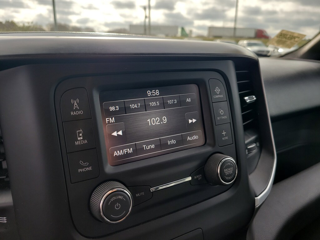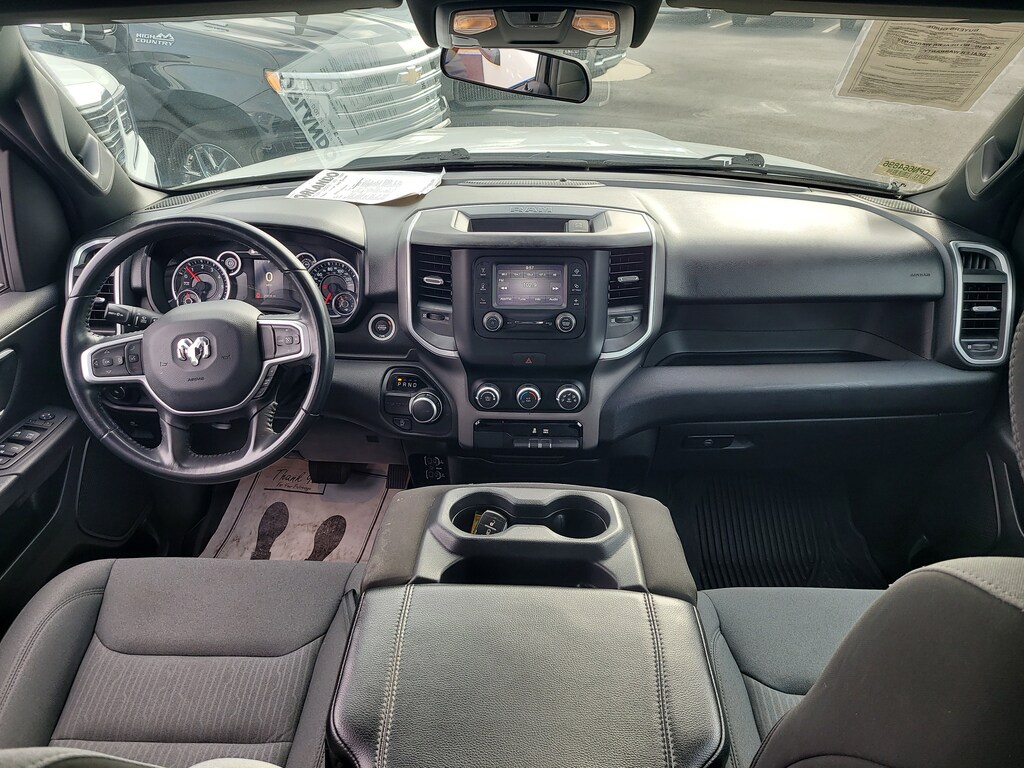 THIS VEHCILE INCLUDES THE FOLLOWING OPTIONS AND FEATURES: Quick Order Package 27Z Big Horn (Big Horn Badge), 3 Rear Seat Head Restraints, 3.21 Rear Axle Ratio, 4 Way Front Headrests, 4-Wheel Disc Brakes, 48V Belt Starter Generator, 6 Speakers, ABS brakes, Air Conditioning, Alloy wheels, AM/FM radio, Black Exterior Mirrors, Brake assist, Bumpers: chrome, Cloth Bench Seat, Compass, Convex Wide-Angle Exterior Mirror Insert, Delay-off headlights, Driver door bin, Dual front impact airbags, Dual front side impact airbags, Electronic Stability Control, Emergency communication system: SiriusXM Guardian, Exterior Mirrors w/Heating Element, Exterior Parking Camera Rear, For Details, Visit DriveUconnect.com, Front anti-roll bar, Front Center Armrest w/Storage, Front License Plate Bracket, Front reading lights, Front Seat Back Map Pockets, Front wheel independent suspension, Fully automatic headlights, Global Telematics Box Module (TBM), GPS Antenna Input, Heated door mirrors, Illuminated entry, Integrated Voice Command w/Bluetooth, Leather steering wheel, Low tire pressure warning, Manufacturer's Statement of Origin, MOPAR Front & Rear Rubber Floor Mats, Occupant sensing airbag, Outside temperature display, Overhead airbag, Overhead console, Panic alarm, Passenger door bin, Passenger vanity mirror, Power door mirrors, Power steering, Power windows, Radio data system, Radio: Uconnect 3 w/5" Display, RAM Grille Badge - Chrome, Rear 60/40 Folding Seat, Rear anti-roll bar, Rear seat center armrest, Rear step bumper, Remote keyless entry, Speed control, Split folding rear seat, Steering wheel mounted audio controls, Tachometer, Telescoping steering wheel, Tilt steering wheel, Traction control, Trip computer, Variably intermittent wipers, Voltmeter, and Wheels: 18" x 8" Cast-Aluminum Painted.