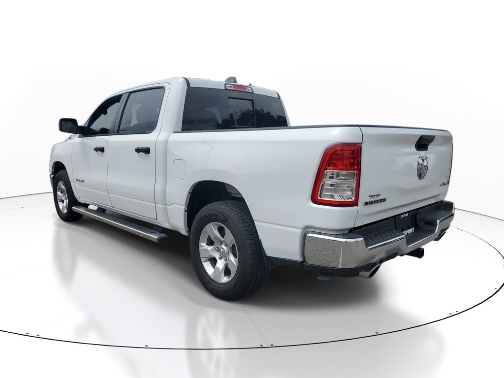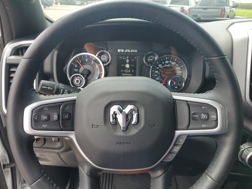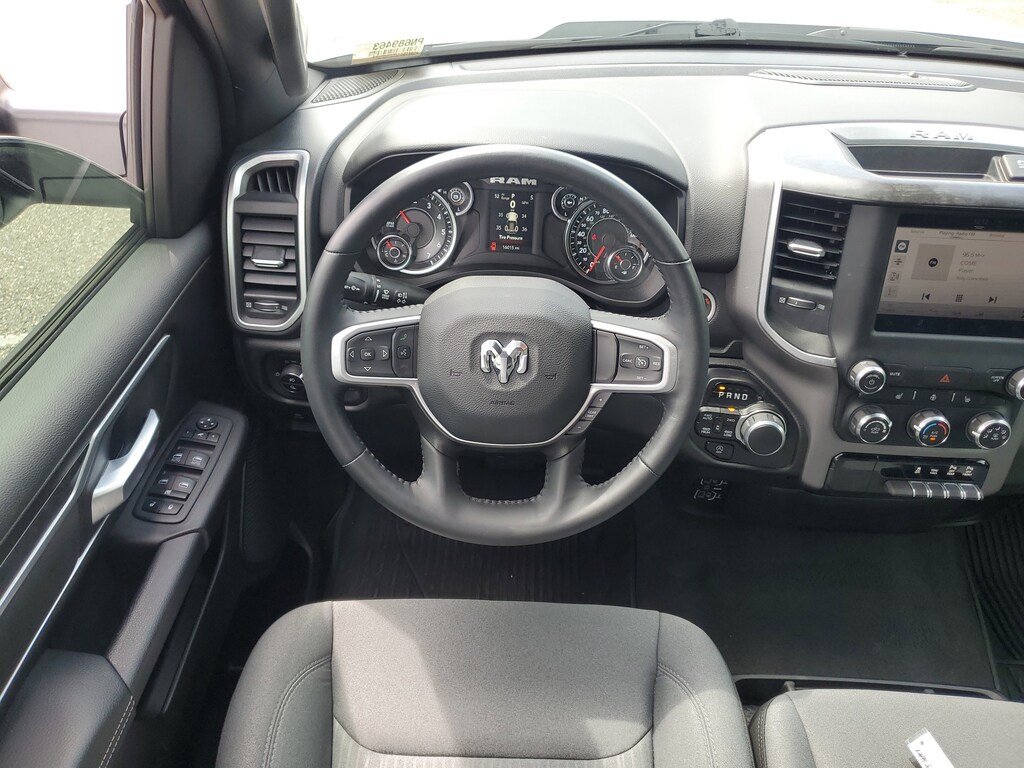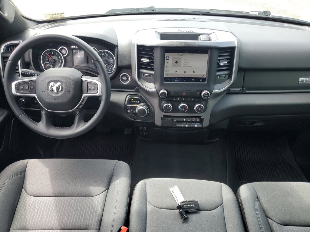 THIS VEHCILE INCLUDES THE FOLLOWING OPTIONS AND FEATURES: Bed Utility Group (MOPAR 4 Adjustable Cargo Tie-Down Hooks, MOPAR Deployable Bed Step, MOPAR Spray In Bedliner, and Pick-Up Box Lighting), Big Horn Level 1 Equipment Group (2nd Row In Floor Storage Bins, 4G LTE Wi-Fi Hot Spot, 8.4" Touchscreen Display, Apple CarPlay, Auto-Dimming Exterior Driver Mirror, Auto-Dimming Rear-View Mirror, Black Exterior Mirrors, Black Premium Power Mirrors, Bluetooth Handsfree Phone & Audio, Class IV Receiver Hitch, Connectivity - US/Canada, Convex Wide-Angle Exterior Mirror Insert, Electric Shift-On-Demand Transfer Case, Exterior Mirrors Courtesy Lamps, Exterior Mirrors w/Heating Element, Exterior Mirrors w/Supplemental Signals, For Details, Visit DriveUconnect.com, For More Info, Call 800-643-2112, Front Fog Lamps, Glove Box Lamp, Google Android Auto, GPS Antenna Input, Heated Front Seats, Heated Steering Wheel, Integrated Center Stack Radio, Passenger Sun Visor w/Illuminated Mirror, Power-Folding Mirrors, Radio: Uconnect 5 W w/8.4" Display, Rear Dome w/On/Off Switch Lamp, Rear Power Sliding Window, Rear Window Defroster, SiriusXM Satellite Radio, and USB Host Flip), Quick Order Package 27Z Big Horn (Big Horn Badge), 3 Rear Seat Head Restraints, 3.21 Rear Axle Ratio, 4 Way Front Headrests, 4-Wheel Disc Brakes, 48V Belt Starter Generator, 6 Speakers, ABS brakes, Air Conditioning, Alloy wheels, AM/FM radio, Brake assist, Bumpers: chrome, Cloth Bench Seat, Compass, Delay-off headlights, Driver door bin, Dual front impact airbags, Dual front side impact airbags, Electronic Stability Control, Emergency communication system: SiriusXM Guardian, Front anti-roll bar, Front Center Armrest w/Storage, Front reading lights, Front Seat Back Map Pockets, Front wheel independent suspension, Fully automatic headlights, Global Telematics Box Module (TBM), Heated door mirrors, Illuminated entry, Integrated Voice Command w/Bluetooth, Leather steering wheel, Low tire pressure warning, MOPAR Front & Rear Rubber Floor Mats, Occupant sensing airbag, Outside temperature display, Overhead airbag, Overhead console, Panic alarm, ParkSense Front/Rear Park Assist w/Stop, ParkView Rear Back-Up Camera, Passenger door bin, Passenger vanity mirror, Power door mirrors, Power steering, Power windows, Radio data system, Radio: Uconnect 3 w/5" Display, RAM Grille Badge - Chrome, Rear 60/40 Folding Seat, Rear anti-roll bar, Rear seat center armrest, Rear step bumper, Remote keyless entry, Remote Start System, Speed control, Split folding rear seat, Steering wheel mounted audio controls, Tachometer, Telescoping steering wheel, Tilt steering wheel, Traction control, Trip computer, Variably intermittent wipers, Voltmeter, and Wheels: 18" x 8" Cast-Aluminum Painted.