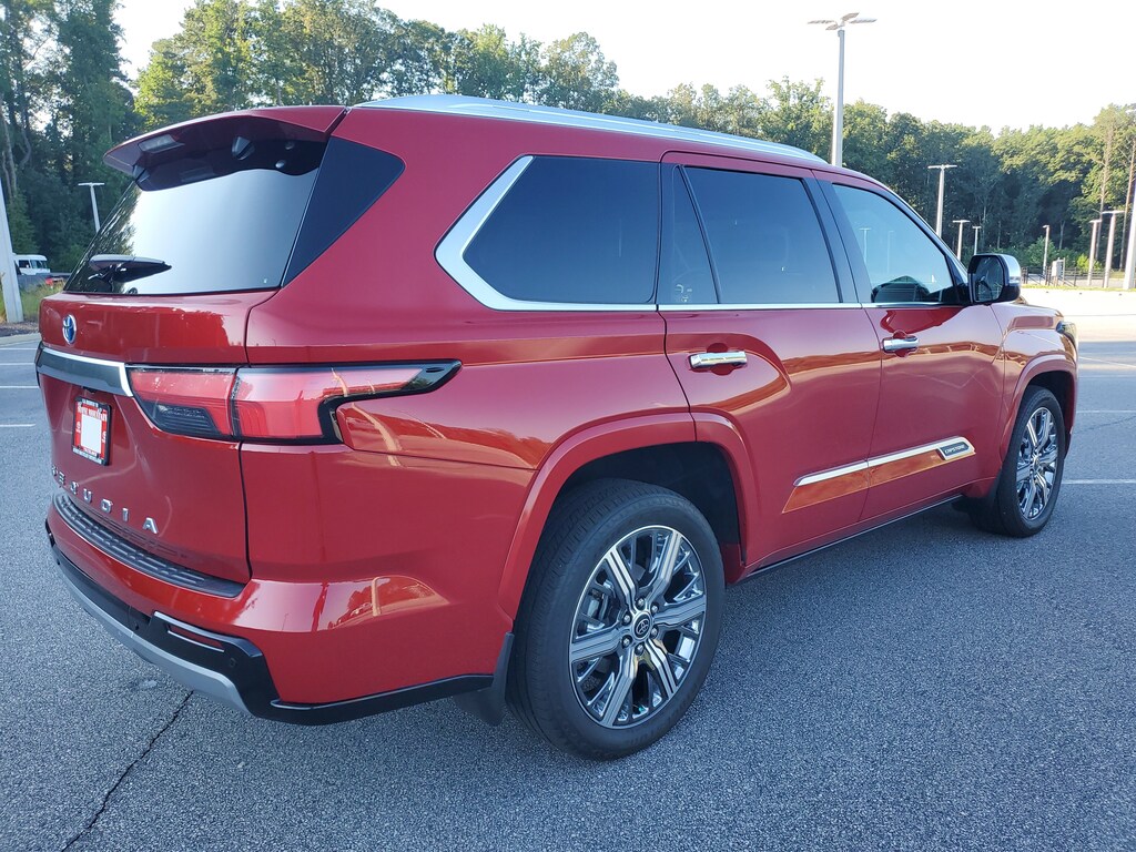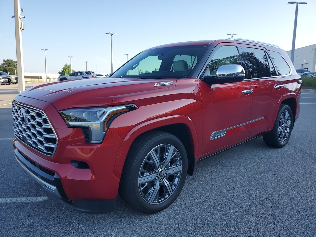 Supersonic Red 2023 Toyota Sequoia Capstone 10-Speed Automatic V6 Hybrid V6 Hybrid, 10-Speed Automatic, 4WD, ABS brakes, Active Cruise Control, Alloy wheels, Compass, Electronic Stability Control, Front dual zone A/C, Heated & Ventilated Front Seats, Heated door mirrors, Heated front seats, Heated rear seats, Illuminated entry, Low tire pressure warning, Navigation System, Power Liftgate, Power moonroof, Remote keyless entry, Semi-Aniline Leather Seat Trim, Traction control.