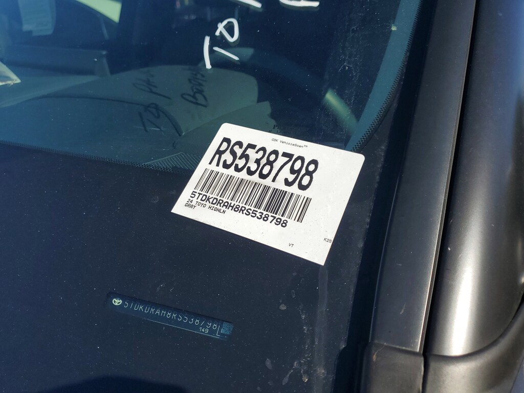 2024 Toyota Highlander 2.4L I4 PDI Turbocharged DOHC 16V LEV3-SULEV30 265hp Gray This vehicle also comes equipped with: 18 Painted Alloy Wheels, 3.329 Axle Ratio, 3rd row seats: split-bench, 4-Wheel Disc Brakes, 6 Speakers, ABS brakes, Air Conditioning, Alloy wheels, AM/FM radio: SiriusXM, Apple CarPlay/Android Auto, Auto High-beam Headlights, Automatic temperature control, Brake assist, Bumpers: body-color, Delay-off headlights, Driver door bin, Driver vanity mirror, Dual front impact airbags, Dual front side impact airbags, Electronic Stability Control, Emergency communication system: Safety Connect (up to 10-year trial subscription), Exterior Parking Camera Rear, Fabric Seat Trim, Four wheel independent suspension, Front anti-roll bar, Front Bucket Seats, Front Center Armrest, Front dual zone A/C, Front fog lights, Front reading lights, Fully automatic headlights, Heated door mirrors, Illuminated entry, Knee airbag, Leather Shift Knob, Leather steering wheel, Low tire pressure warning, Occupant sensing airbag, Outside temperature display, Overhead airbag, Overhead console, Panic alarm, Passenger door bin, Passenger vanity mirror, Power door mirrors, Power driver seat, Power Liftgate, Power steering, Power windows, Radio: 8 Toyota Audio Multimedia, Rear air conditioning, Rear anti-roll bar, Rear reading lights, Rear seat center armrest, Rear window defroster, Rear window wiper, Reclining 3rd row seat, Remote keyless entry, Security system, Speed control, Speed-sensing steering, Split folding rear seat, Spoiler, Steering wheel mounted audio controls, Tachometer, Telescoping steering wheel, Tilt steering wheel, Traction control, Trip computer, Turn signal indicator mirrors, and Variably intermittent wipers. FWD 8-Speed Automatic Recent Arrival! Odometer is 19553 miles below market average! 22/29 City/Highway MPG
